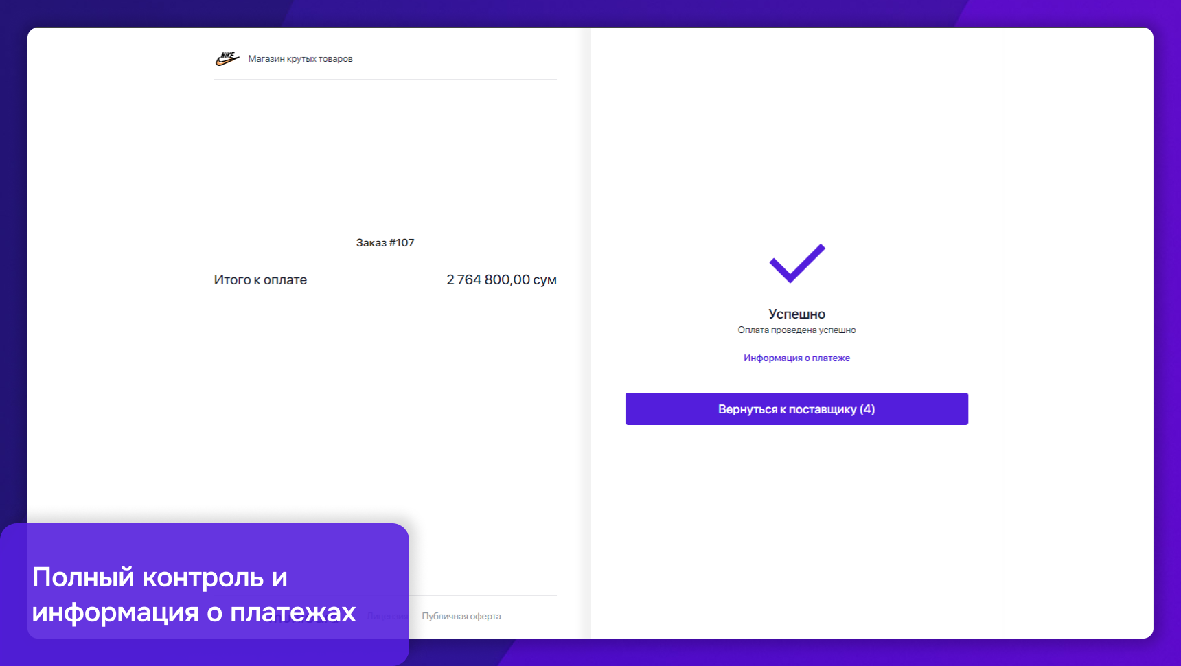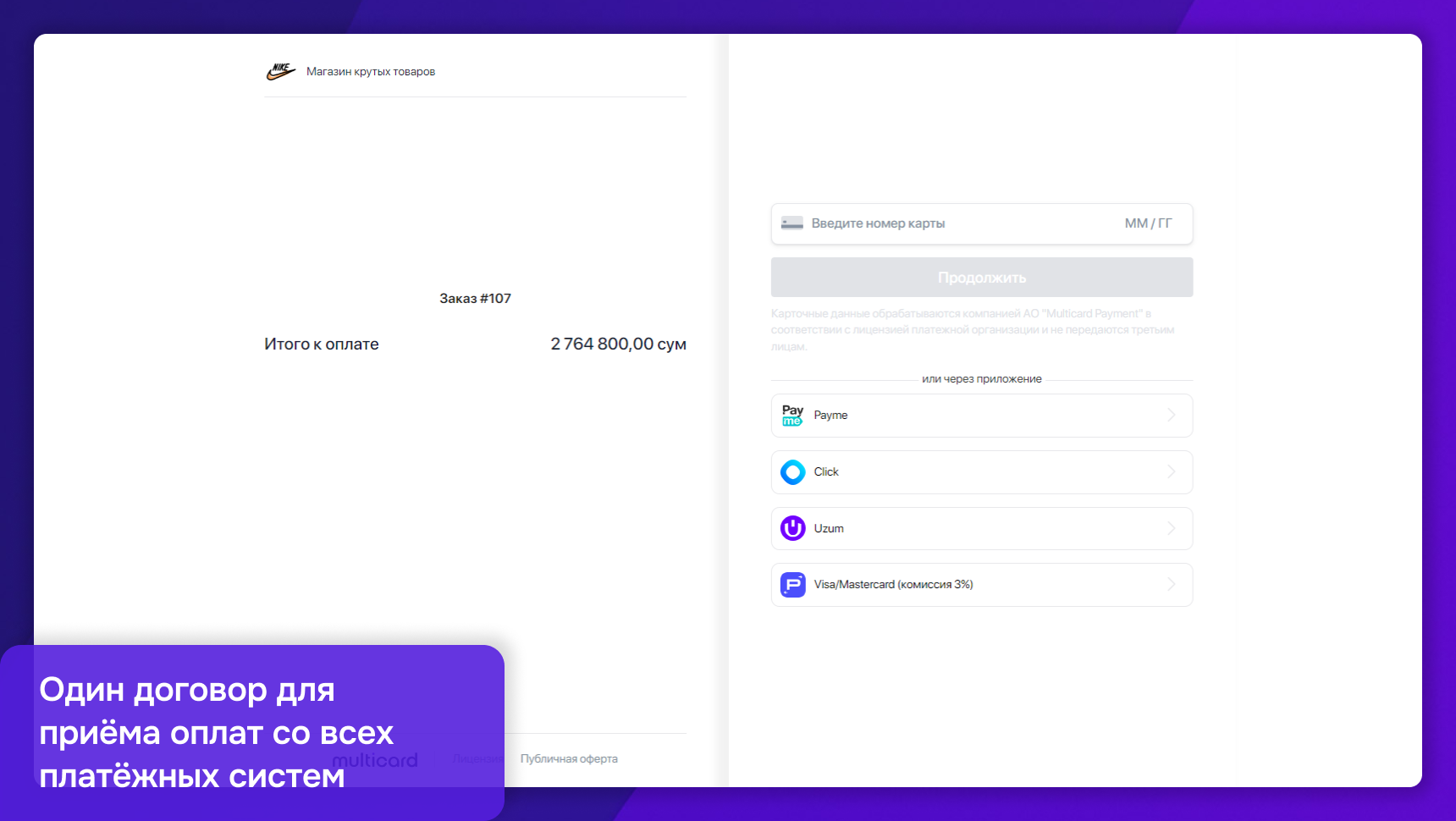 С Multicard вам не нужно заключать отдельные договоры с каждой платёжной организацией. Достаточно единственного договора с АО «Multicard Payment», чтобы принимать платежи от всех. Это упрощает финансовый учёт и документооборот, снижая административные затраты.