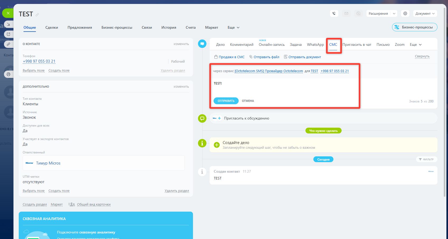 Отправка SMS-сообщений из:- карточки лида, контакта, компании, сделки;