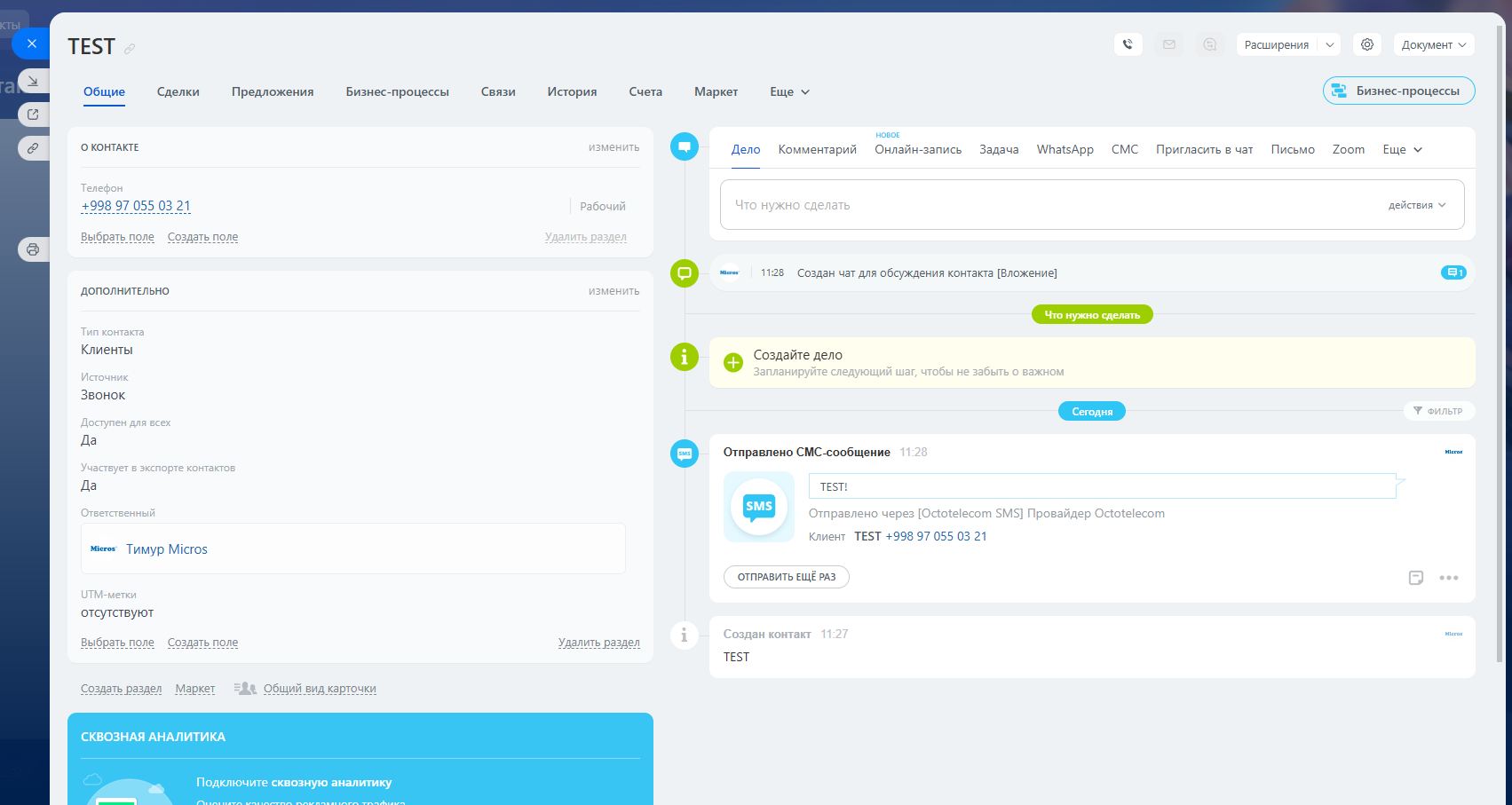 - бизнес-процессов. Сообщение лиду, контакту, компании, сотруднику, на произвольный номер.