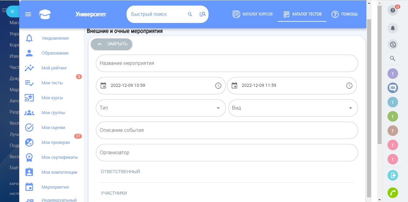 - Учёт внешних мероприятий. Учёт в единой системе: участники и формат мероприятия, провайдер. Возможность собирать обратную связь от участников.