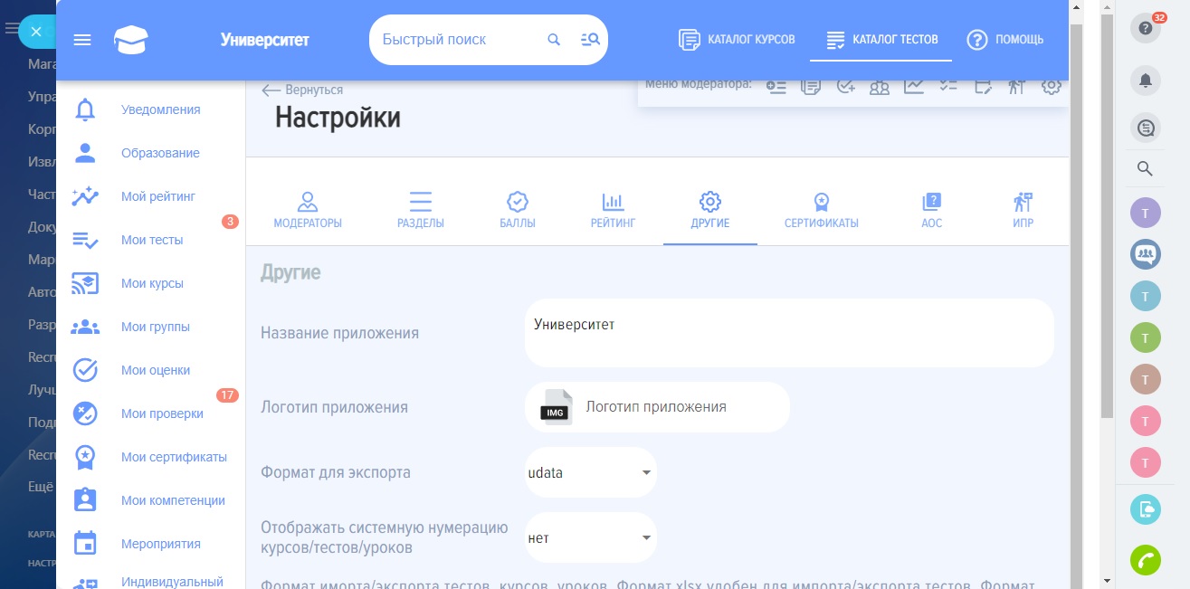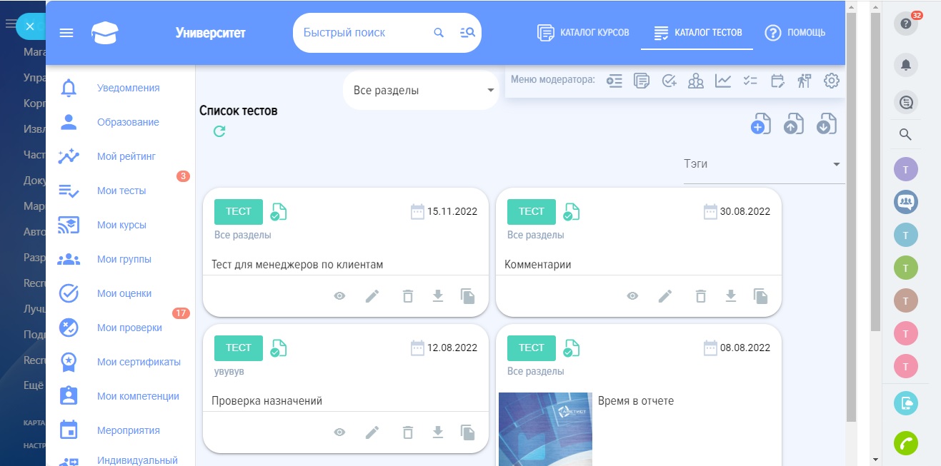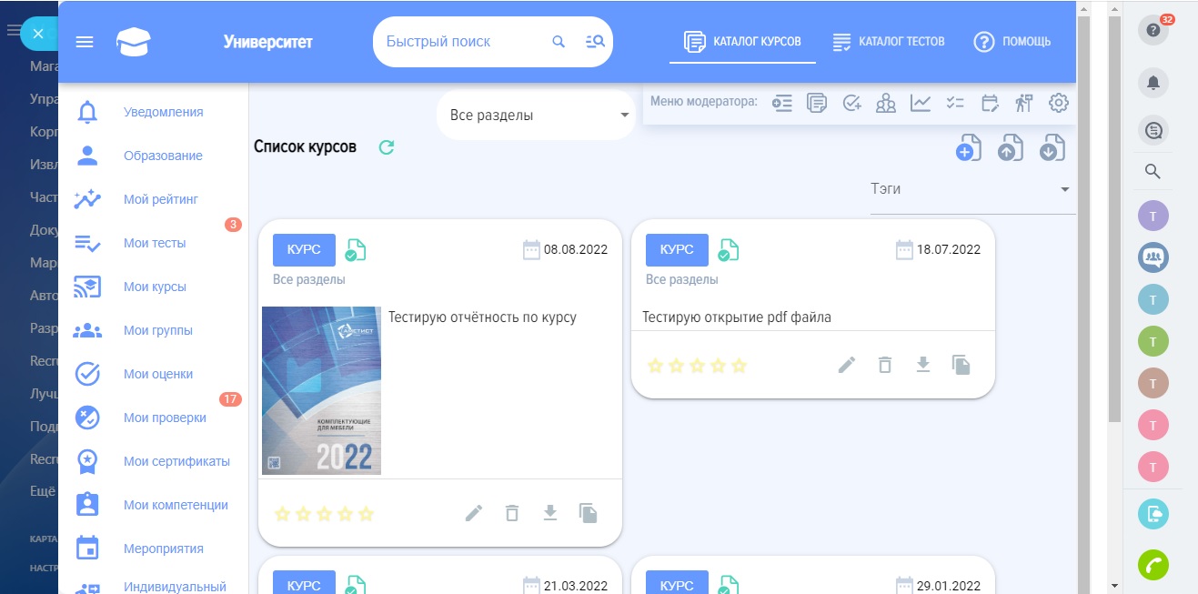 - Комментирование. Возможность открыть комментирование тестов и курсов.