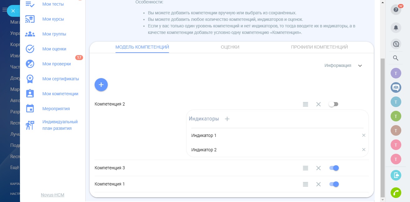 - Модель компетенций. Гибкие шаблоны для создания моделей компетенций, состоящие из компетенций, индикаторов, оценок.