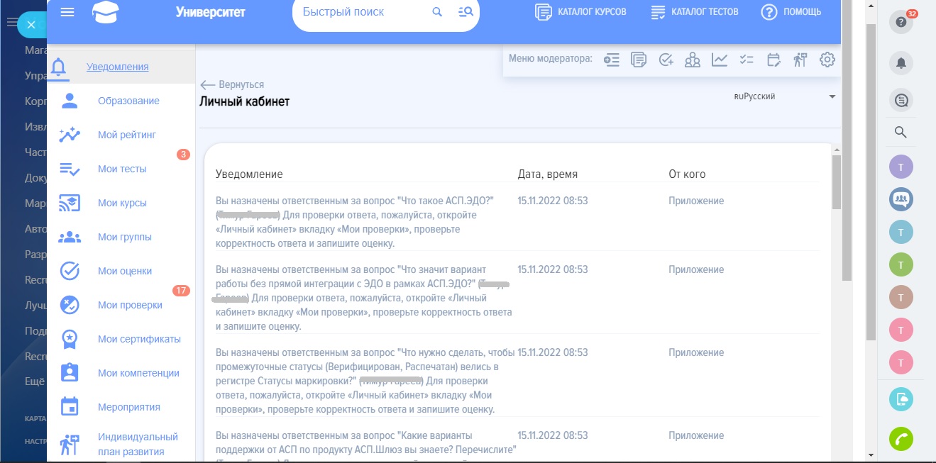 - Отчетность. По результатам заполнения анкет обратной связи формируется отчетность для модераторов.