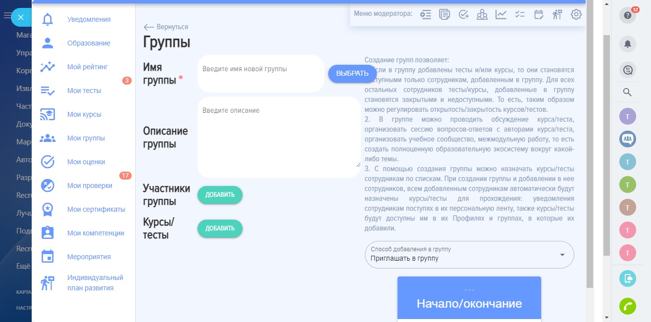 - Функционал групп: обсуждения; задачи; опросы; база знаний; календарь; различные уровни доступа. Вы можете с легкостью организовывать межмодульную работу, поддержку после обучения и т.д.