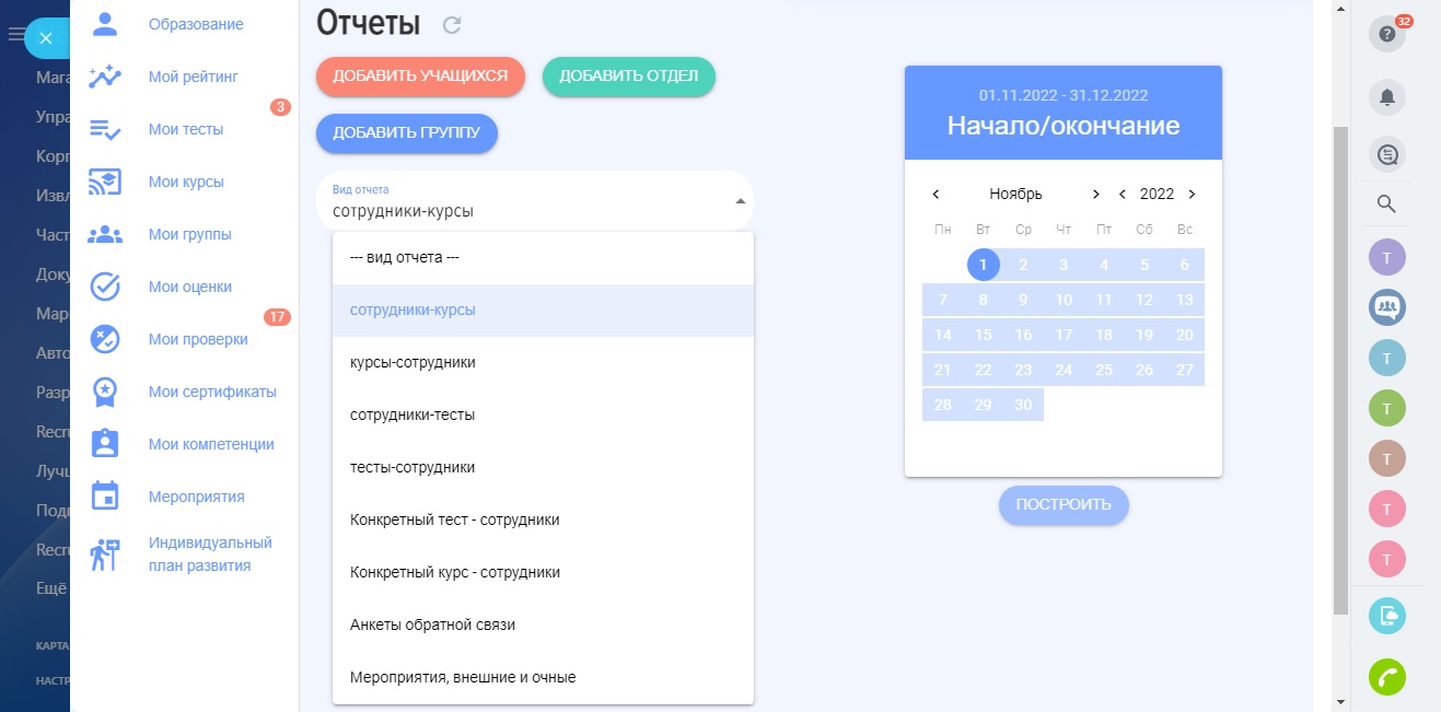 - Восемь видов. Разные типы преднастроенных отчетов закрывают все потребности для контроля, мониторинга процессов обучения и развития.