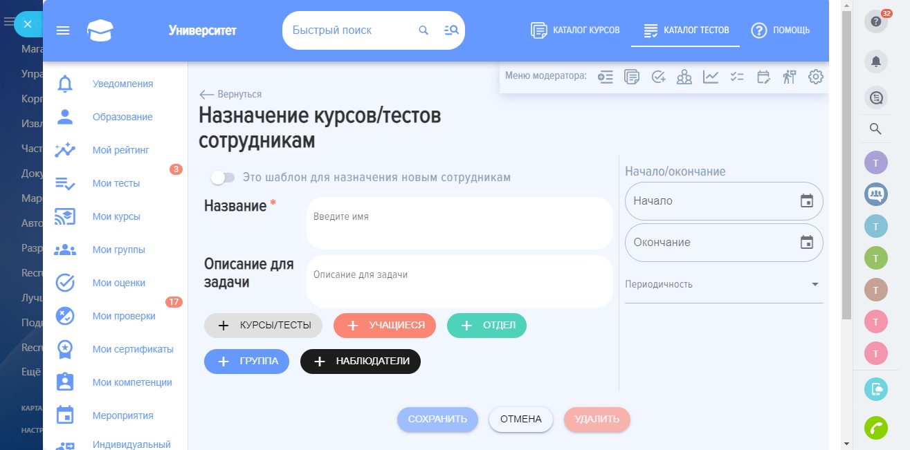 - Ручное назначение. Возможность вручную назначить обучение или тестирование, с выбором сотрудников, курсов/тестов. Указание сроков. Назначения автоматически создают задачи сотрудникам в Битрикс.
