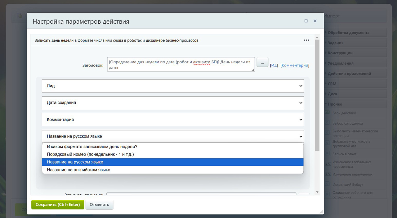 Функционал позволяет сконвертировать данные в формате Дата или Дата и Время в название (полное или сокращенное) дня недели либо соответствующую ему цифру (от 1 до 7).
