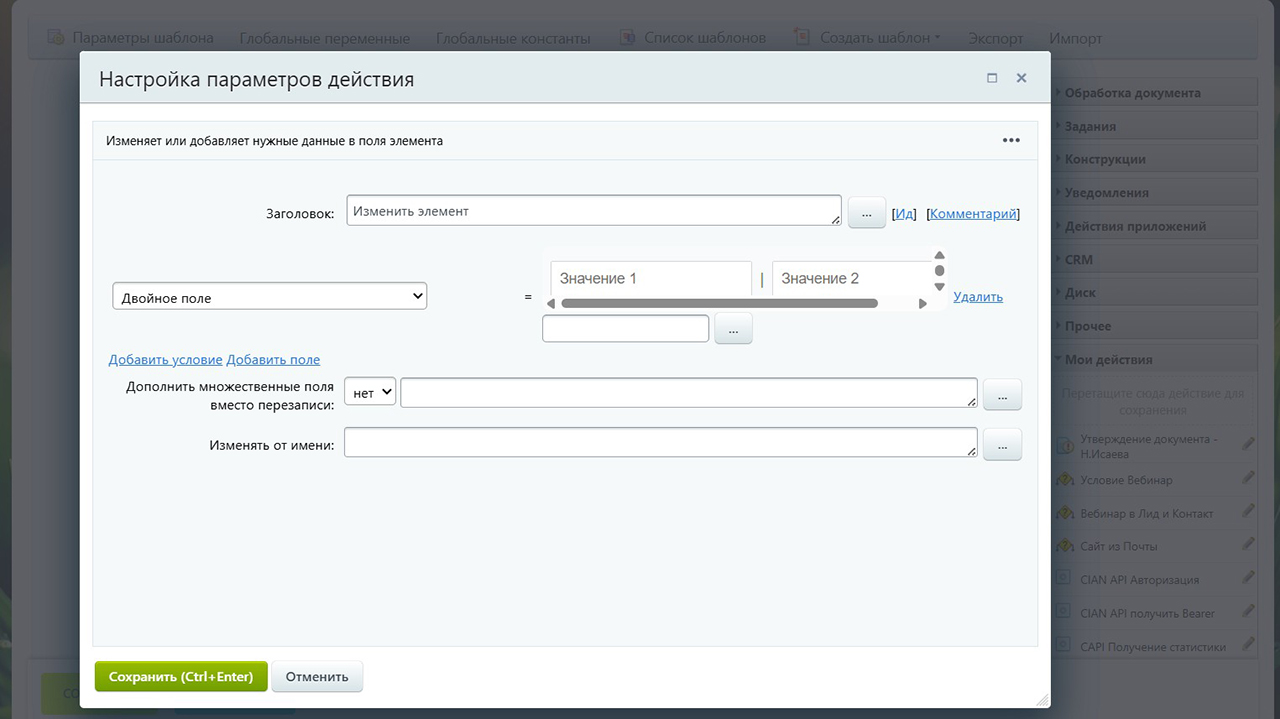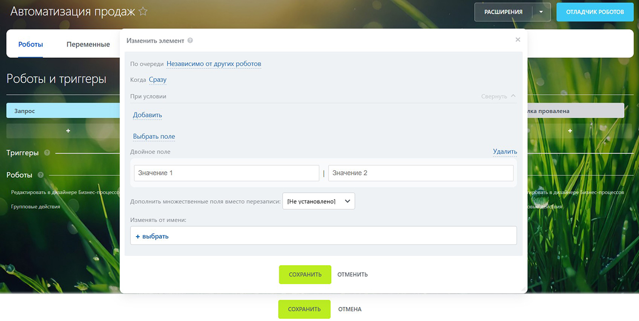 Приложение добавляет новый вид полей в карточках элементов CRM и смарт-процессов, а также соответствующего робота – “Двойные поля”.