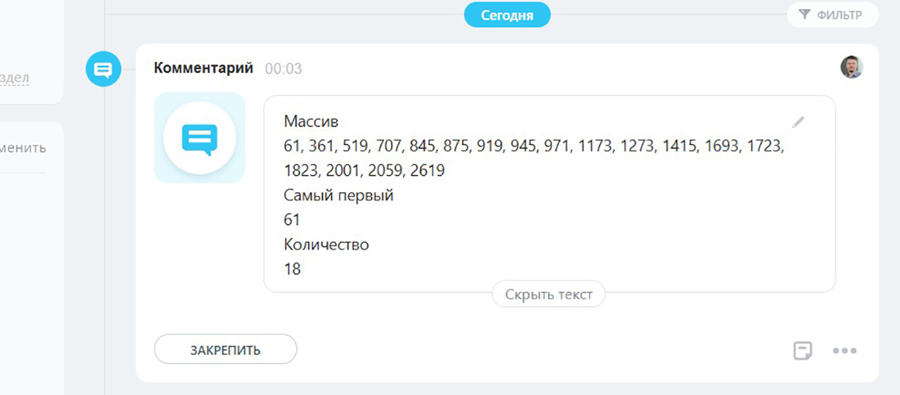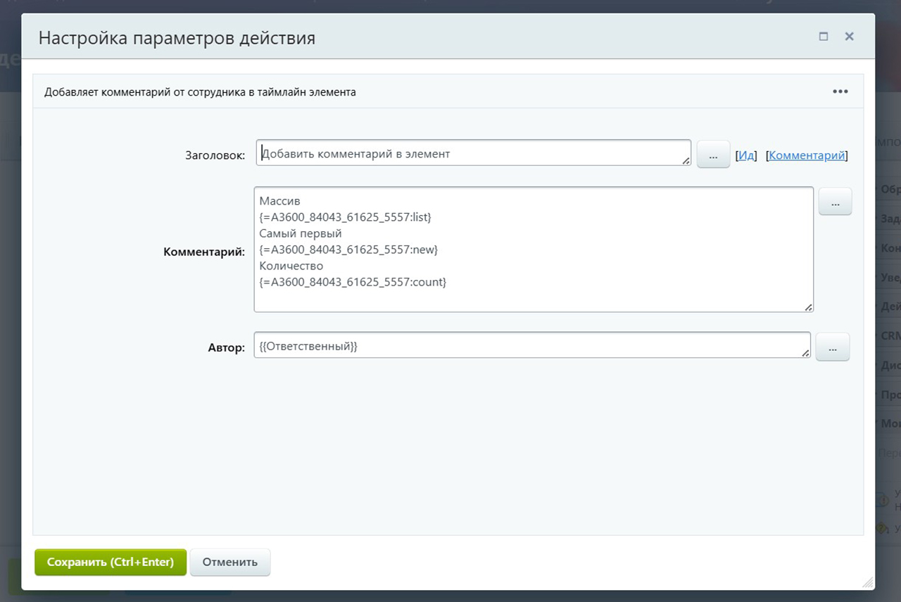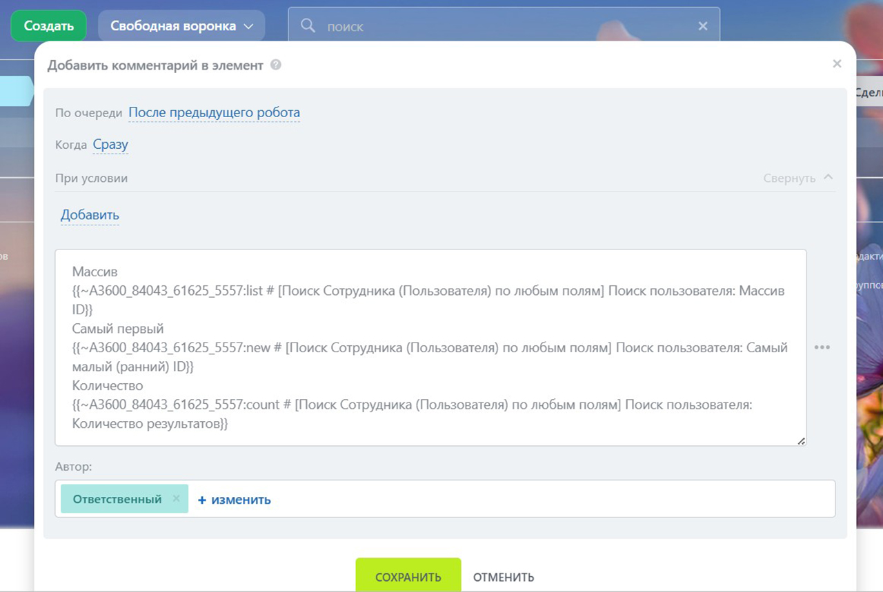 – Массив ID найденных элементов. Его можно использовать в последующих роботах, умных сценариях, шаблонах и дизайнере бизнес-процессов (например, в итераторе);