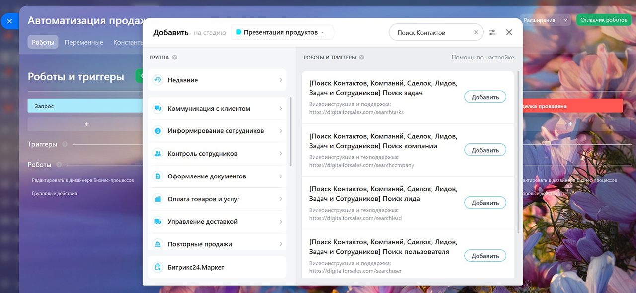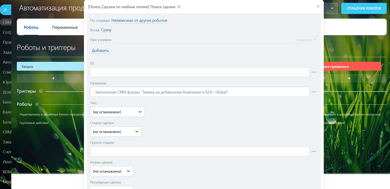 Приложение добавляет новые Активити в Дизайнер бизнес-процессов, а также новых Роботов для поиска Контактов, Компаний, Сделок, Лидов, Задач и Сотрудников (Пользователей).