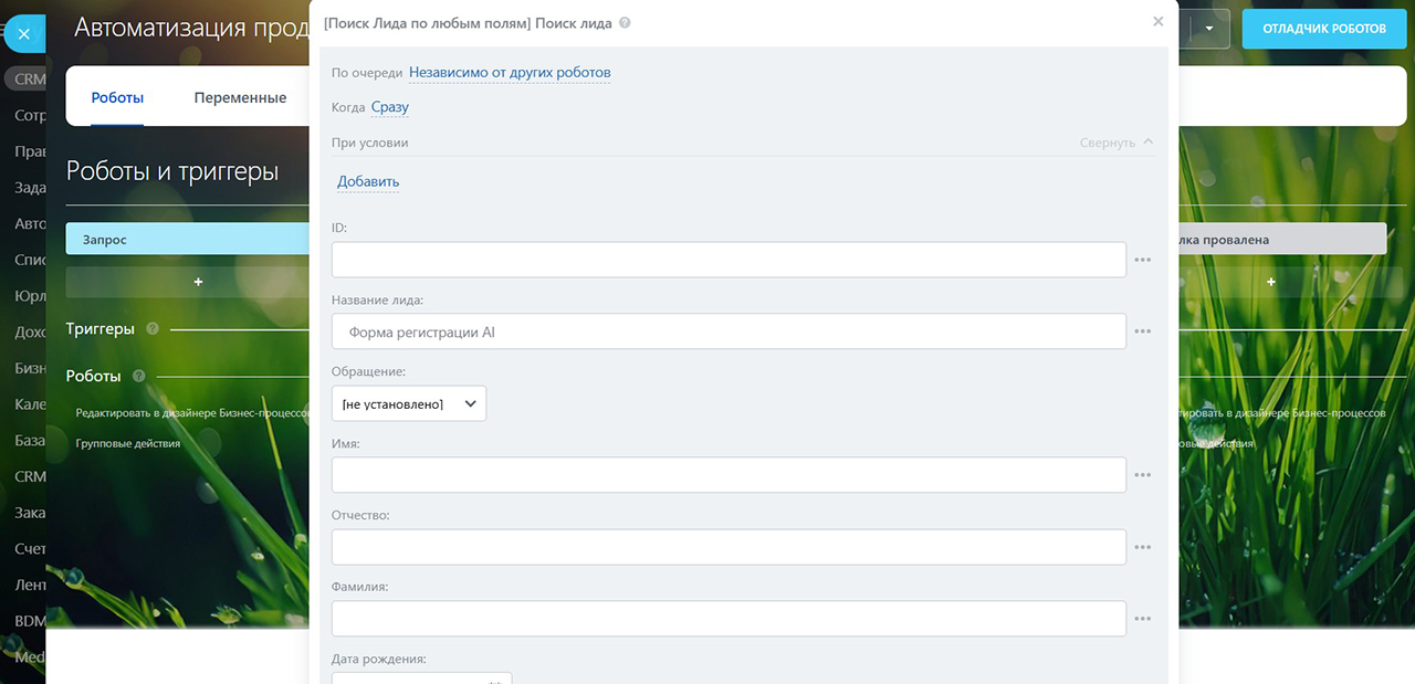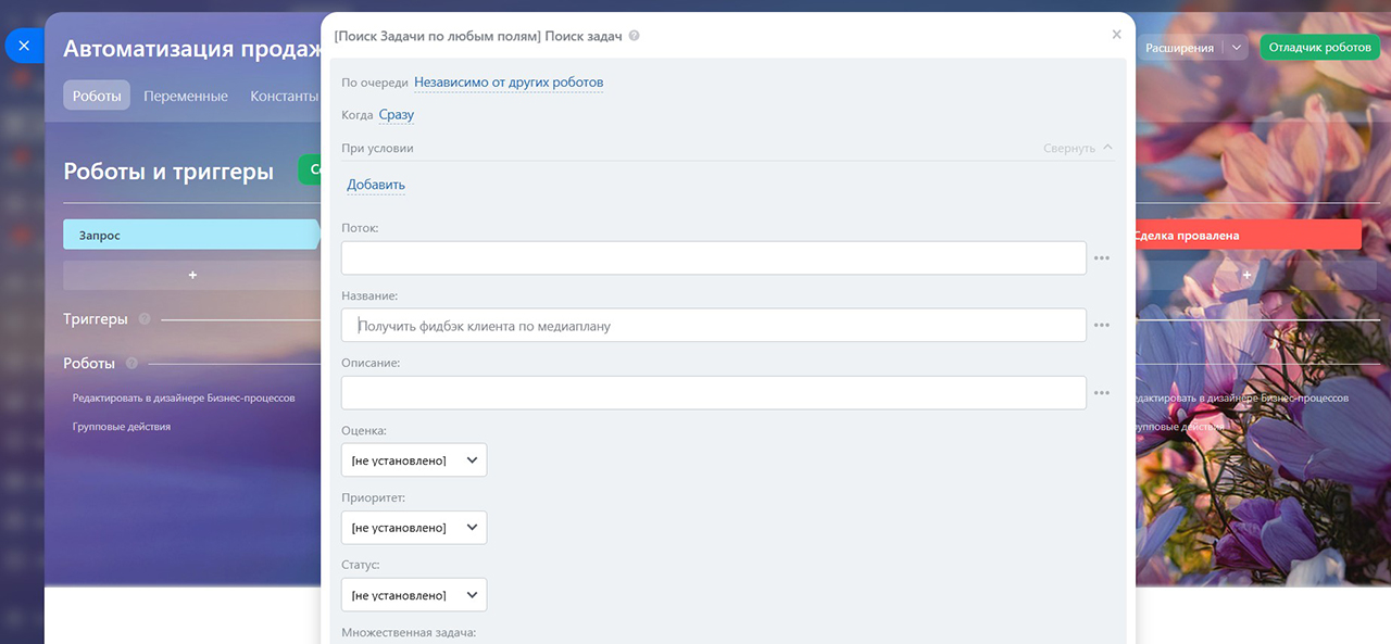 Позволяет найти все элементы CRM, Задачи и Пользователей с указанными значениями стандартных и пользовательских полей с помощью Робота и в Дизайнере бизнес-процессов (активити БП)