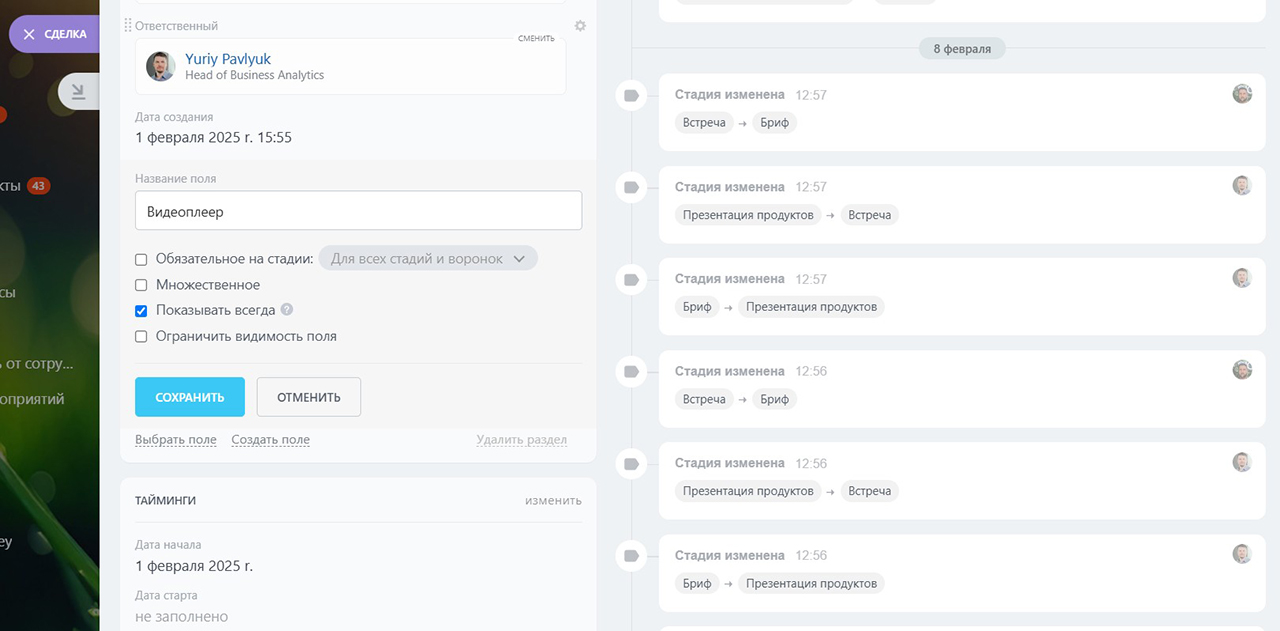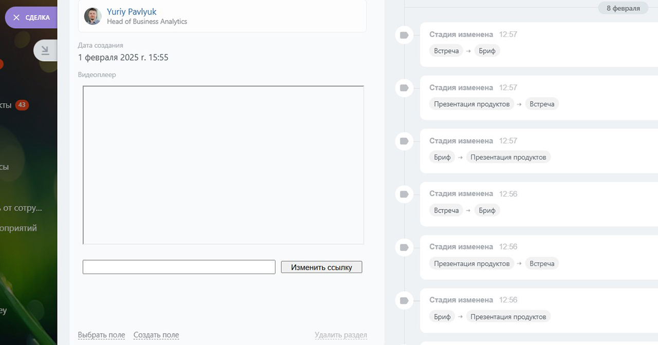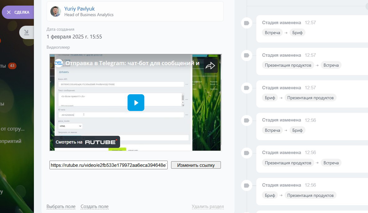 Видеоплеер в карточке CRM: вставка с VK Видео, YouTube, RUTUBE