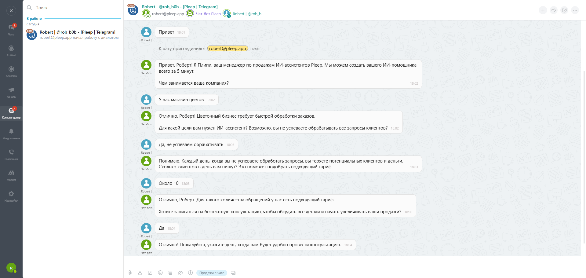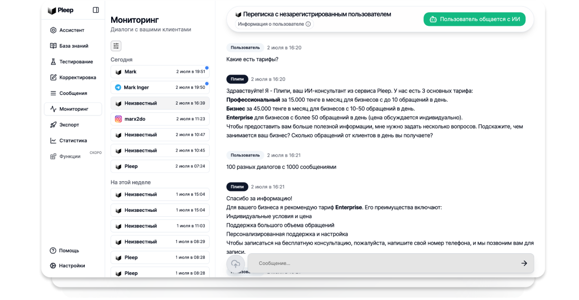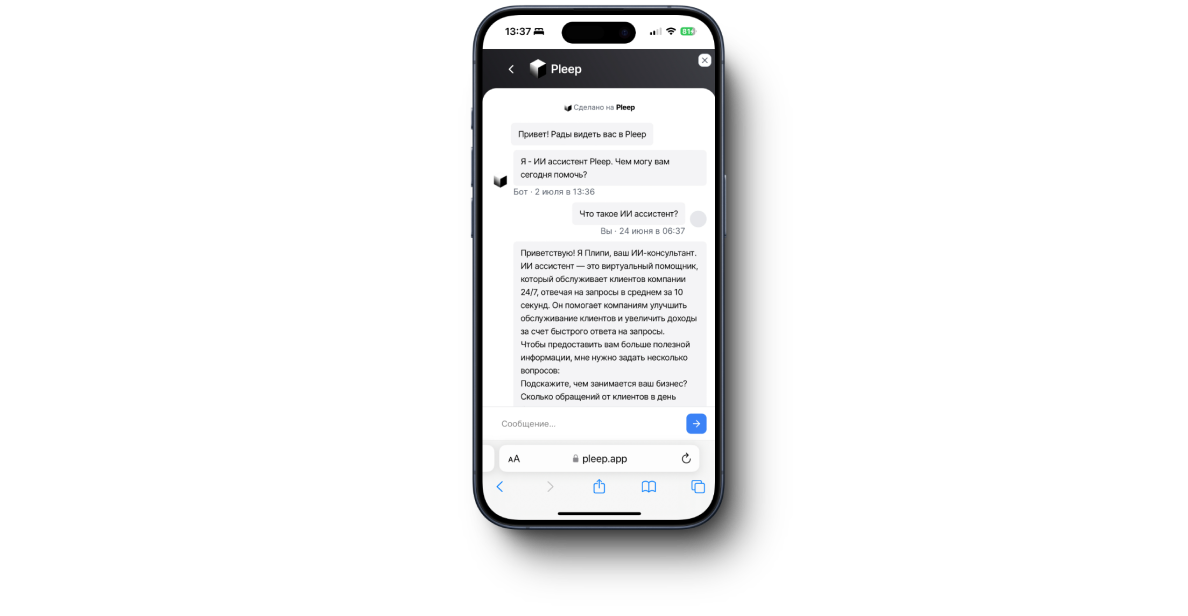 - Круглосуточные скоростные ответы ИИ ассистент от Pleep будет отвечать за 7 секунд и поможет обслуживать ваших на клиентов 24/7