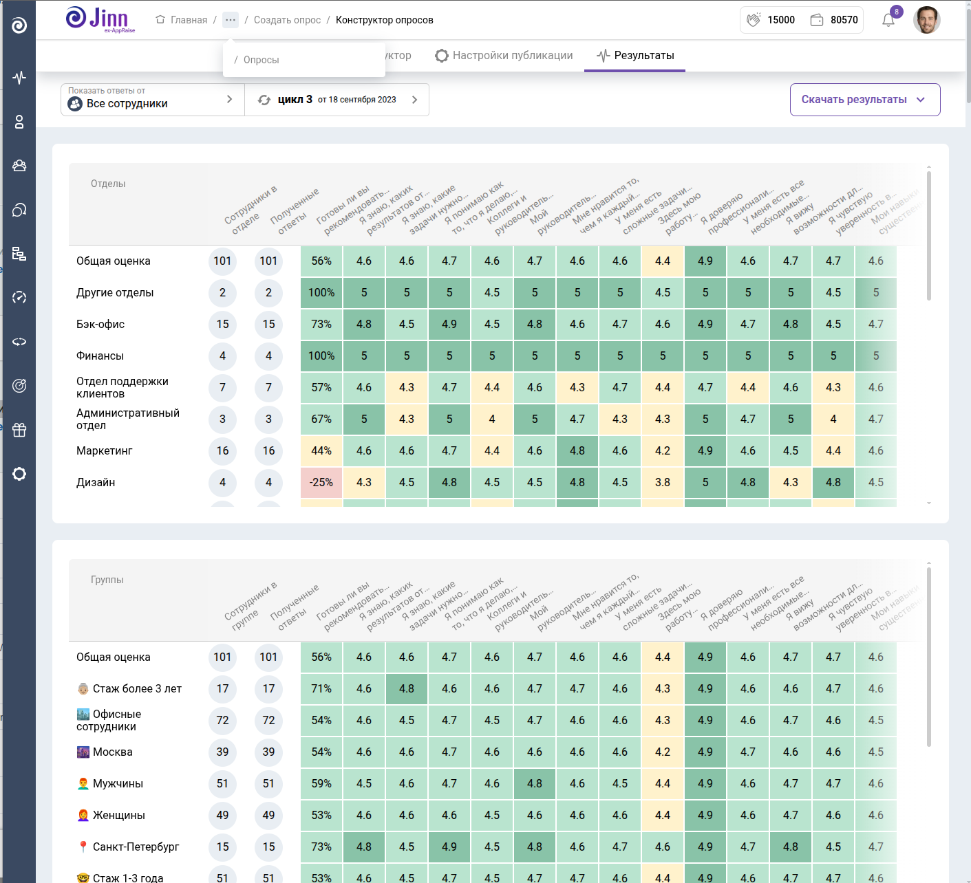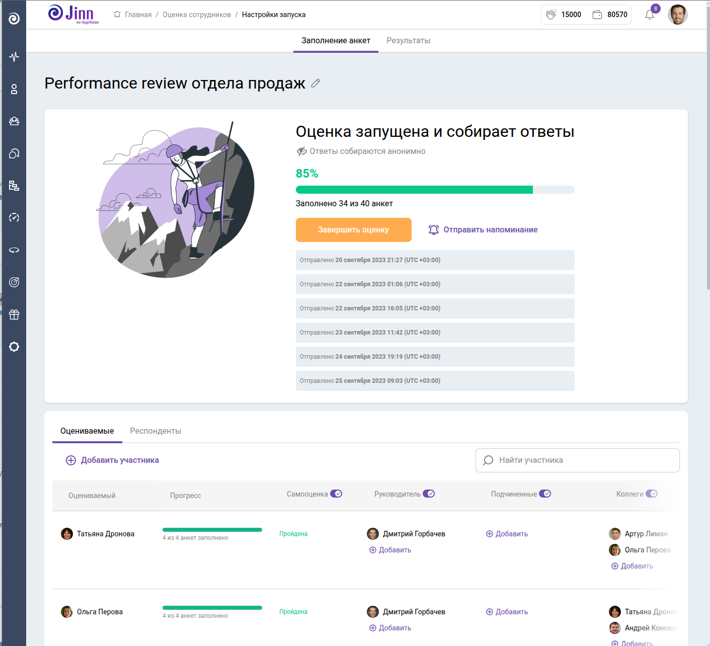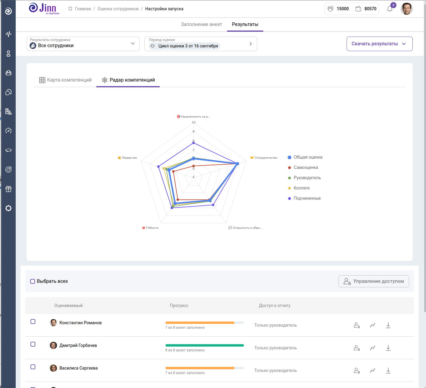 20% руководителей никогда не фиксируют фидбек, а 45% хранят историю в Excel и Word. С Jinn весь фидбек сохраняется автоматически, и вы всегда можете вернуться к вашей обратной связи с коллегами.