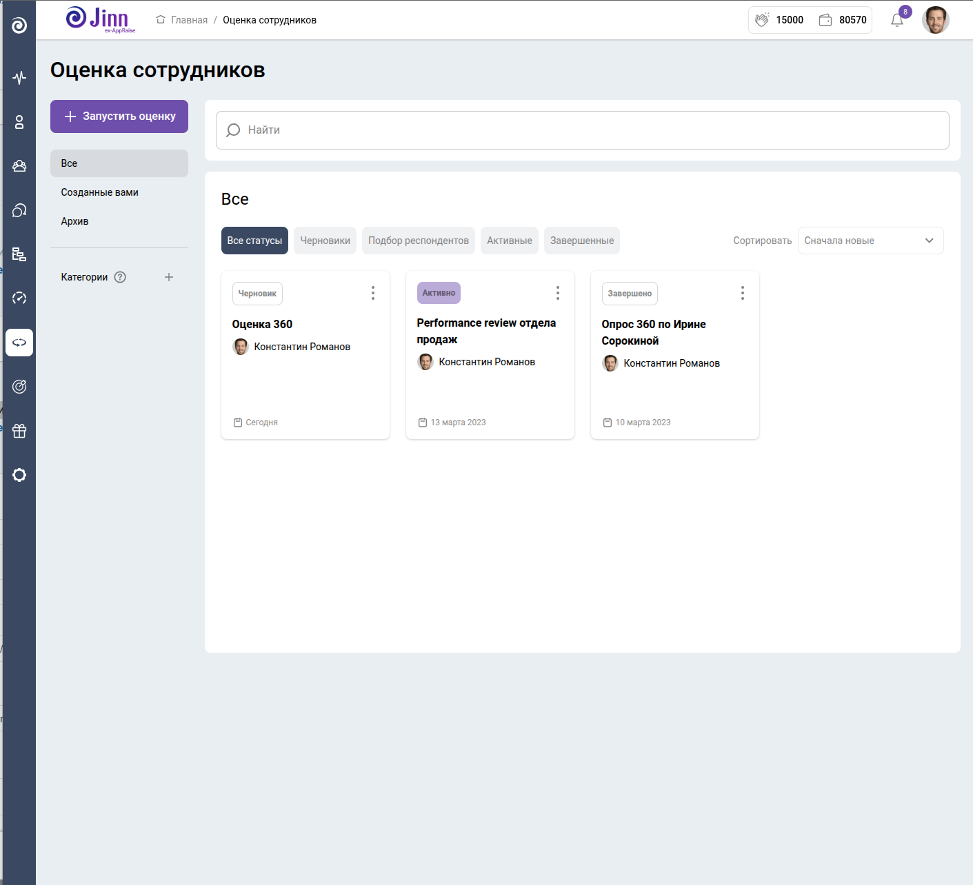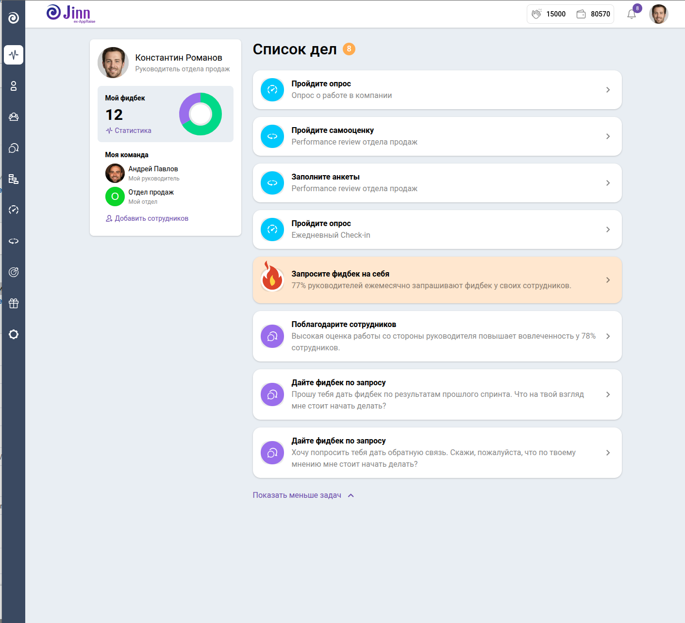В Jinn используется популярная техника обратной связи: Start, Stop, Continue. Подсказки помогут вам и вашим коллегам давать структурированный и действительно полезный фидбек.