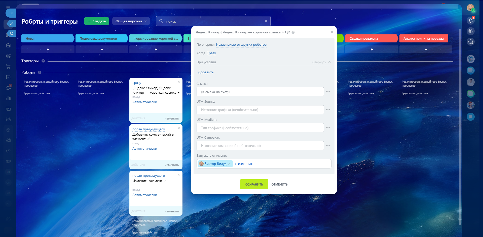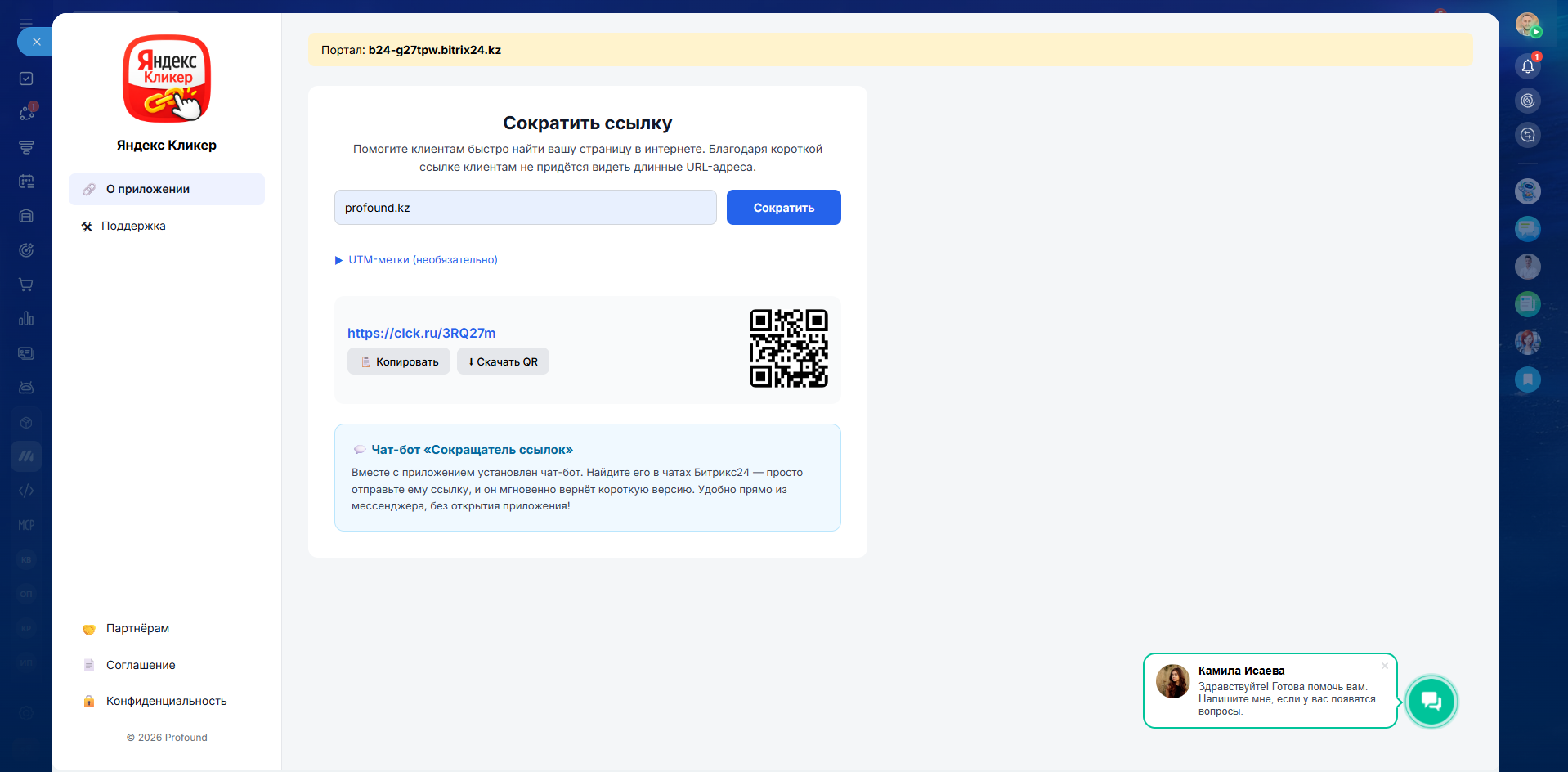 Яндекс Кликер — это простое и удобное приложение для Битрикс24, которое позволяет быстро сокращать длинные ссылки и делиться ими с клиентами в аккуратном и читаемом виде.