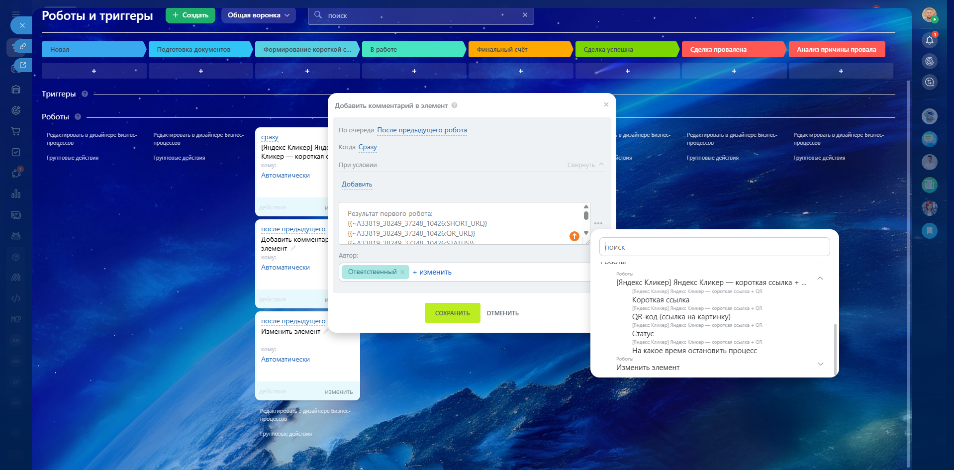 Приложение работает как в интерфейсе Битрикс24, так и в роботах и бизнес-процессах, позволяя автоматически получать короткие ссылки и QR-коды для дальнейшего использования.