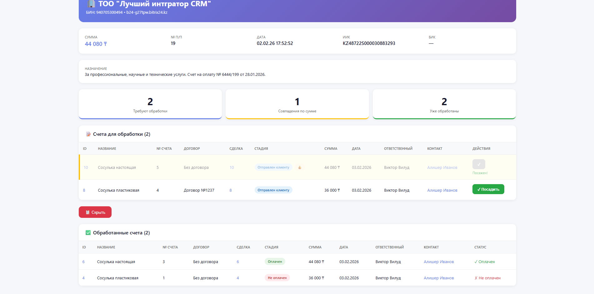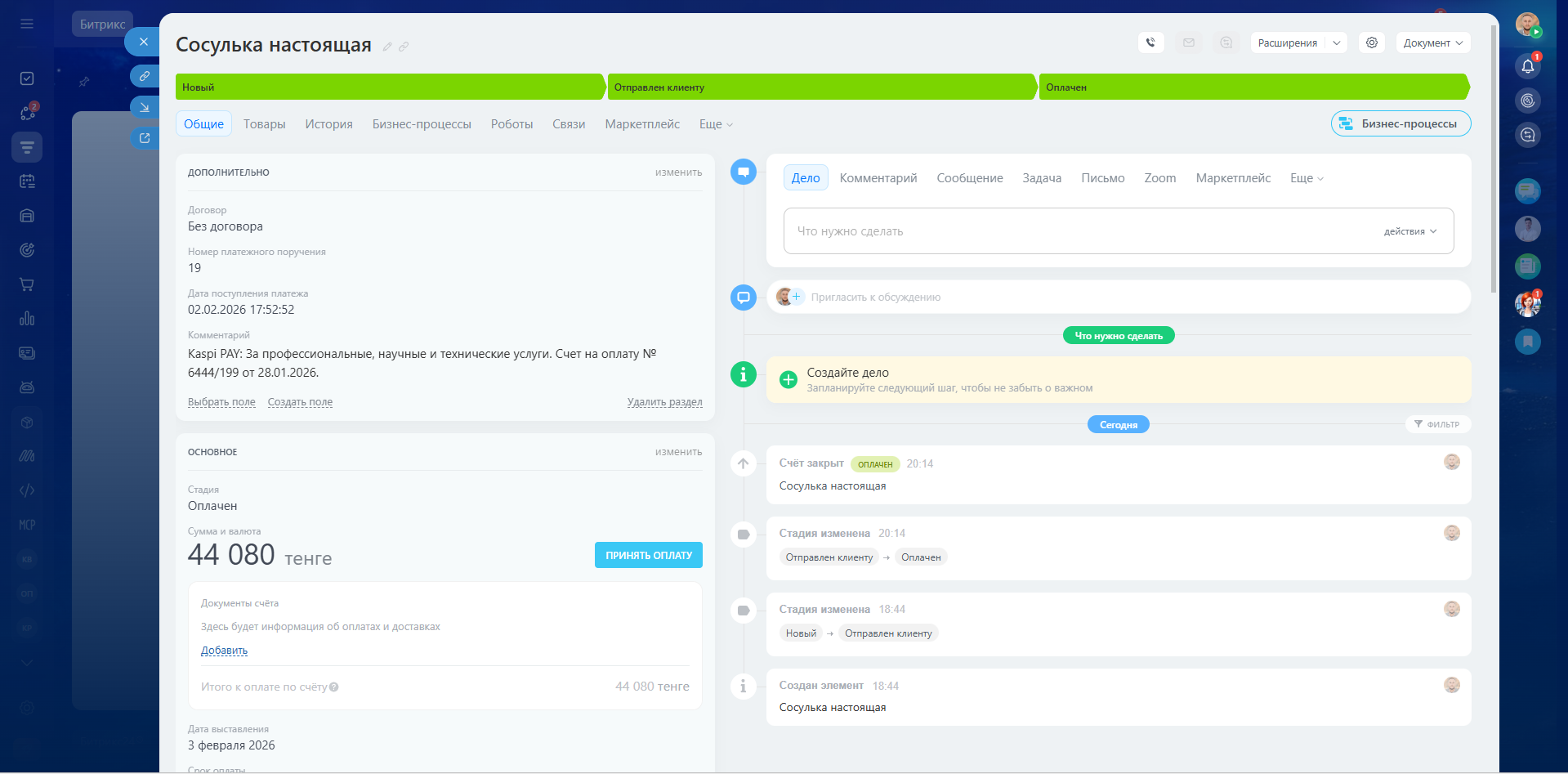 Автоматическая посадка платежей Kaspi Pay в счетах Битрикс24