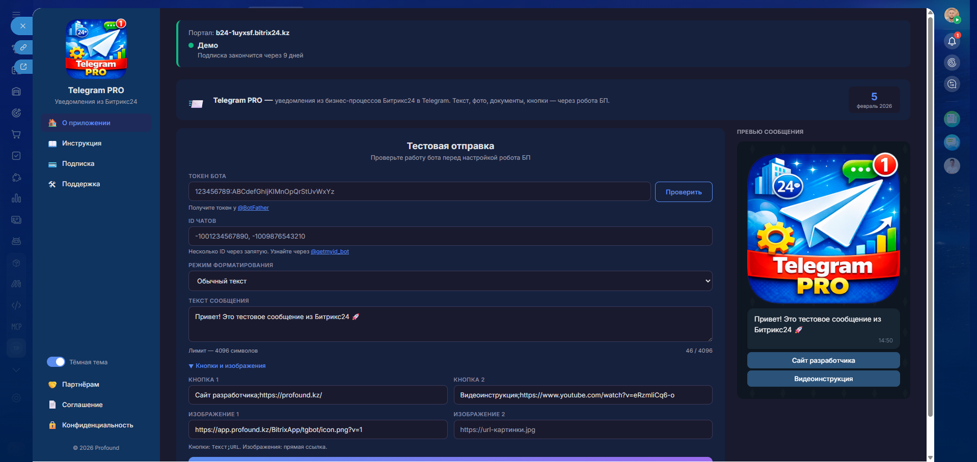 Telegram PRO работает через официальный Telegram Bot API и поддерживает: