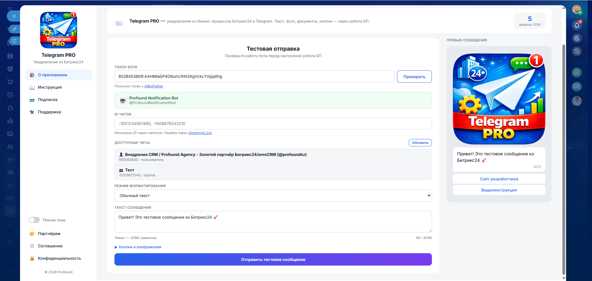 Telegram PRO - это профессиональный модуль интеграции Telegram с корпоративной CRM, который позволяет автоматизировать уведомления, коммуникации и работу с клиентами напрямую через Telegram.
