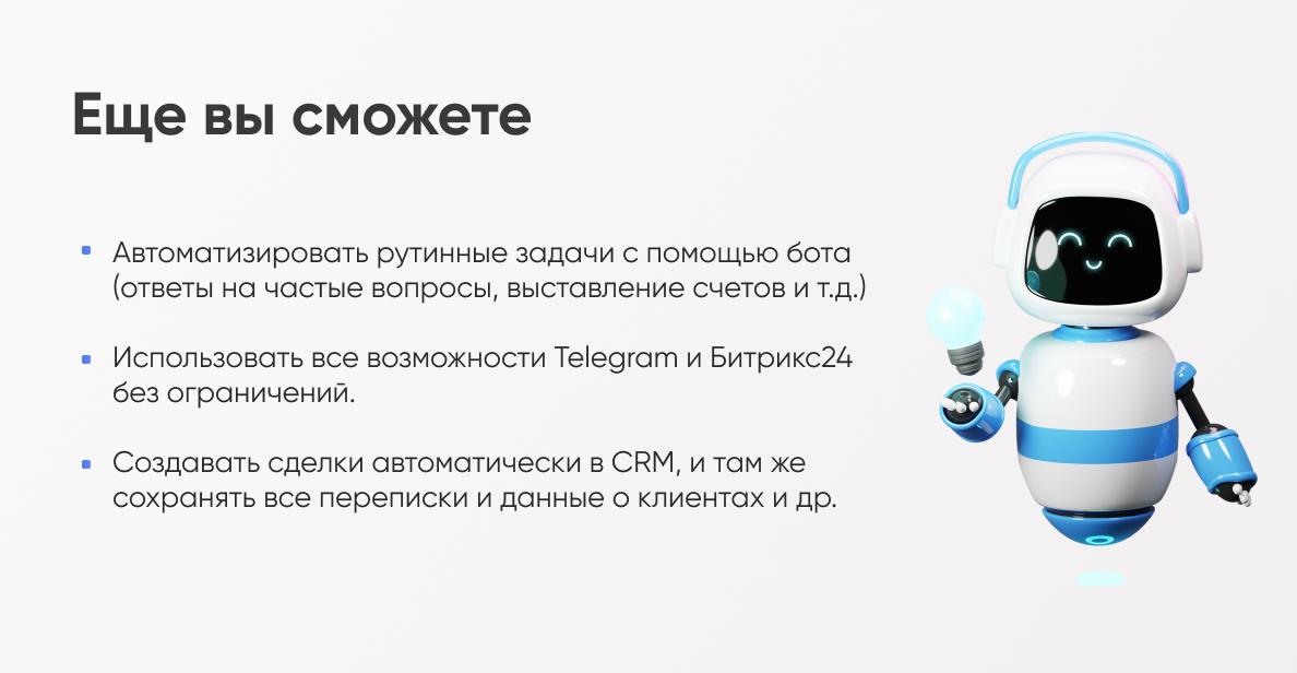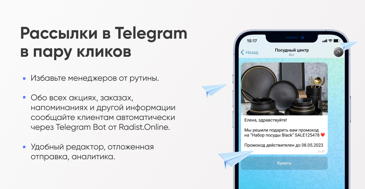 Открываемость сообщений в Telegram до 70%, а путь клиента сокращается в разы: зашел в бота, выбрал товар, оплатил по ссылке за 3 секунды. Удобно, когда все действия в одном чате.