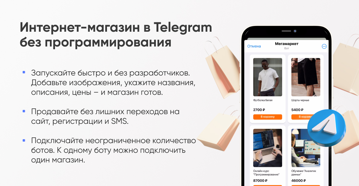 Интернет-магазин в Telegram канале: запускайте интернет-магазин в Telegram за 10 минут без разработчиков и навыков программирования.