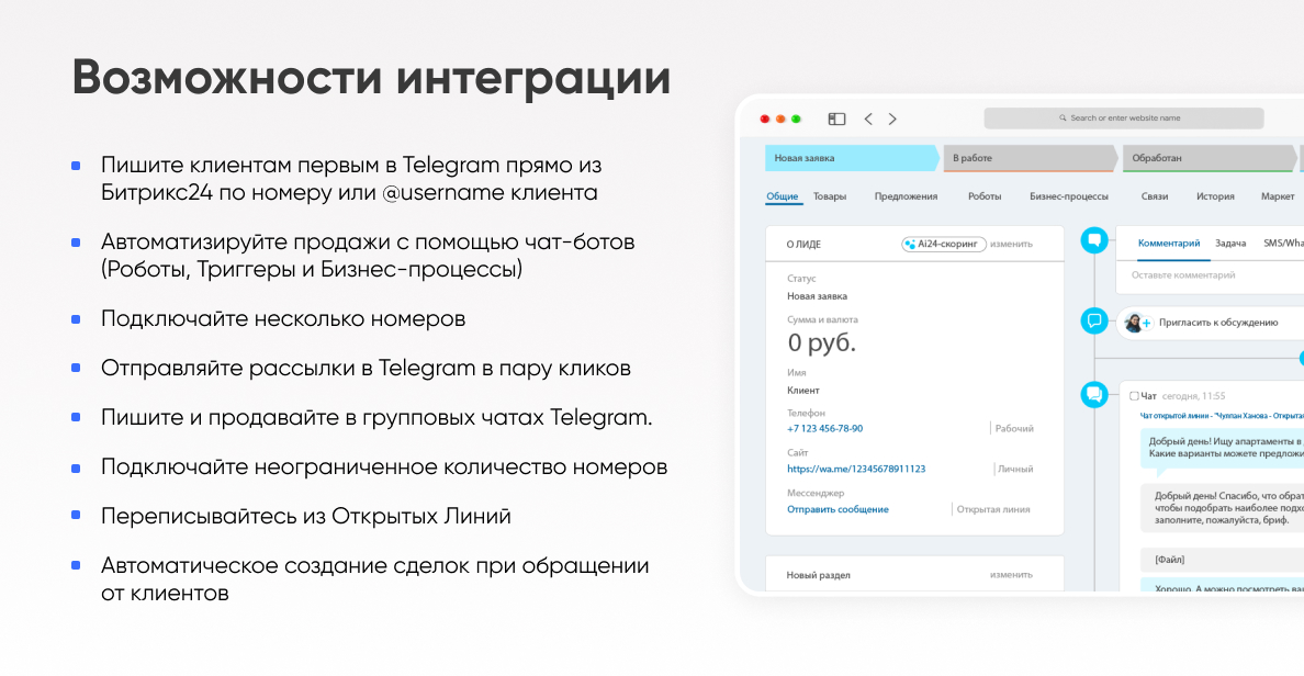 Общайтесь с клиентами в Telegram из RadistWeb: если в Битрикс24 неполадки, вы сможете перейти в RadistWeb и спокойно продолжить диалог. Пишите клиенту первым через @username, а не только по номеру телефона. Отправляйте аудио как аудио, а не файлы с загадочным форматом.