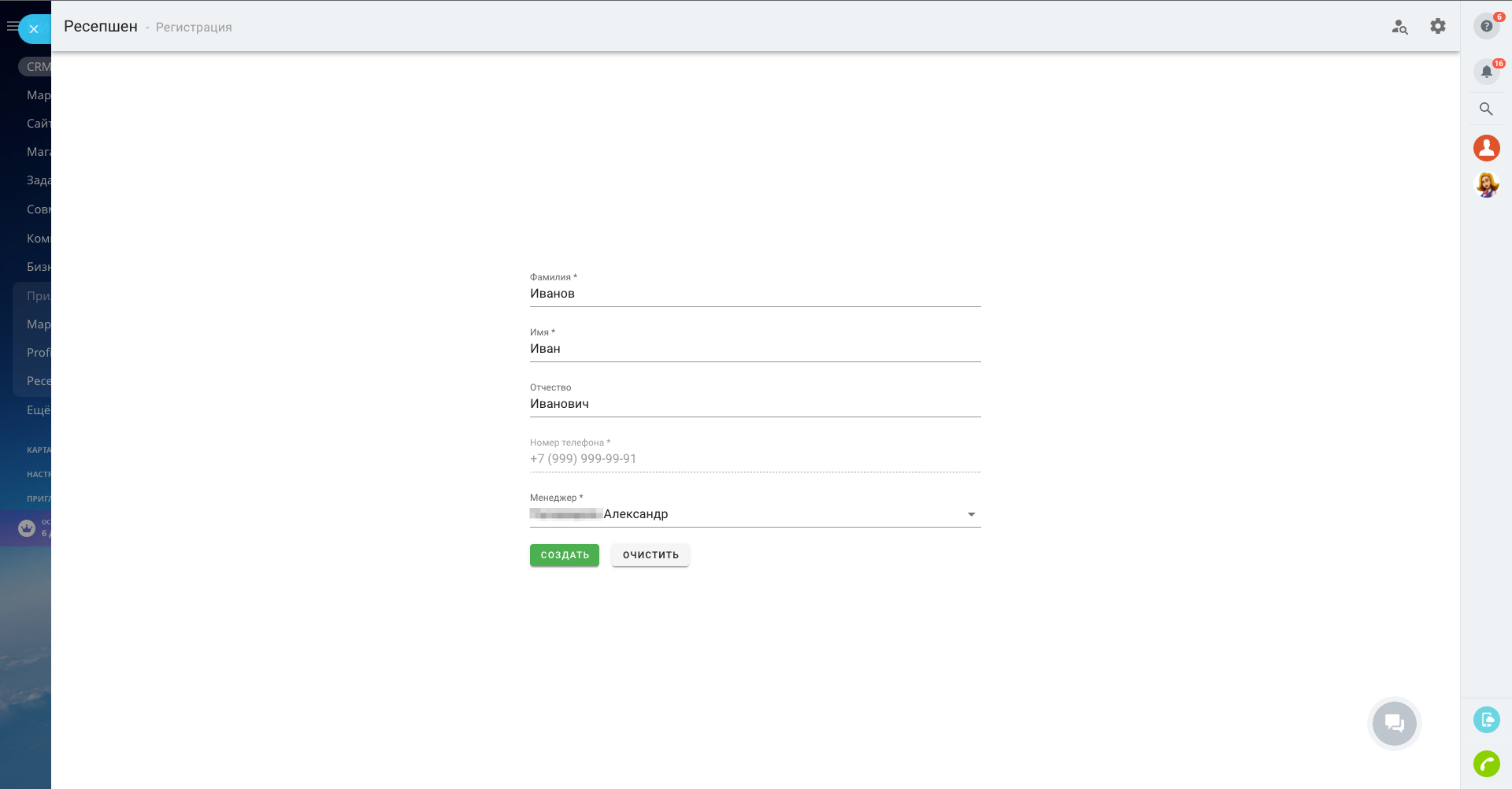 - Новый клиент-пешеход: в приложении мы регистрируем нового клиента с помощью формы с обязательными полями (фамилия, имя, номер, ответственный сотрудник). При создании нового клиента может запускаться бизнес-процесс конвертации лида в нужные сущности с уже заполненными полями (или другой бизнес-процесс, указанный в настройках приложения).