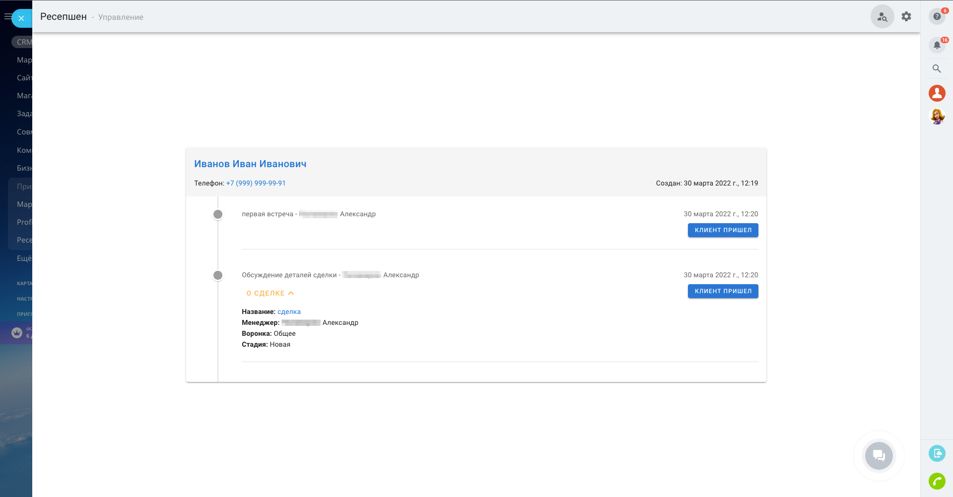 - фиксировать присутствие клиента на встрече;