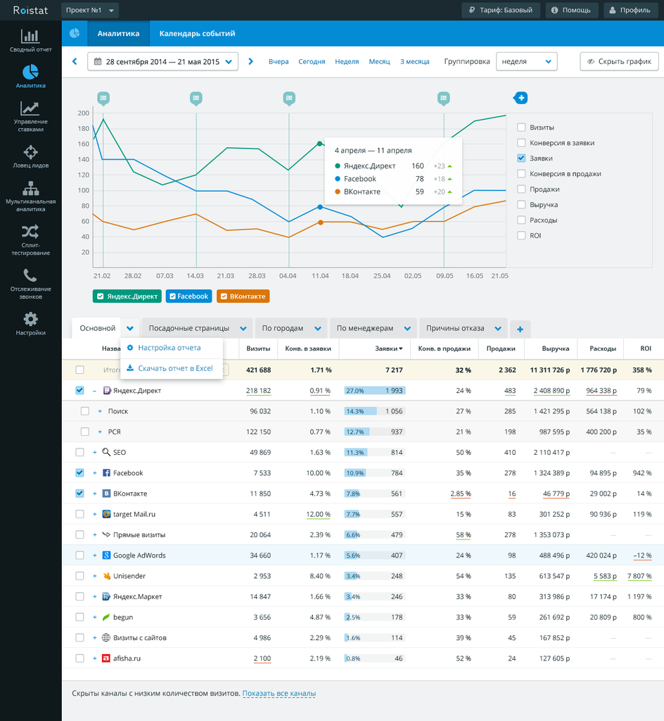 Roistat собирает данные из CRM Битрикс24, рекламных площадок и вашего сайта. Из этих данных он формирует отчеты по 22 ключевым бизнес-показателям: ROI, LTV, CAC, CPC, CPL, CPO, прибыль, конверсии, и др.