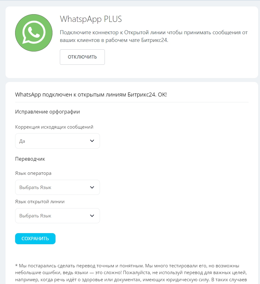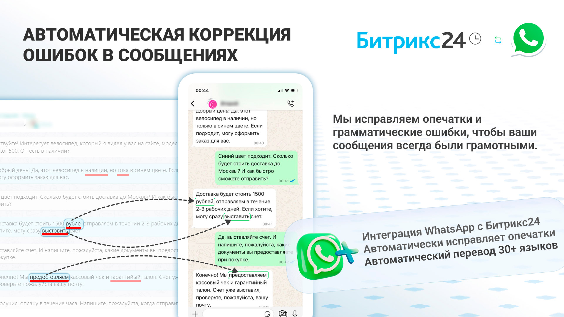WhatsApp PLUS: Простое и лёгкое подключение всего за 30 секунд, без регистрации на других сайтах. Автоматически исправляет опечатки и ошибки в сообщениях. Возможность перевода сообщений на язык клиента, а сообщения клиента — на ваш язык. Ежемесячная абонентская плата 2 490 ₽ включает исправление опечаток, перевод на 30+ языков и возможность писать первым.