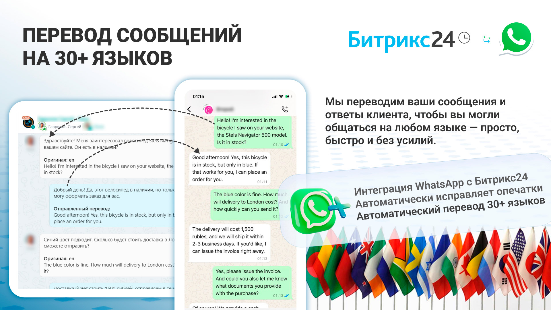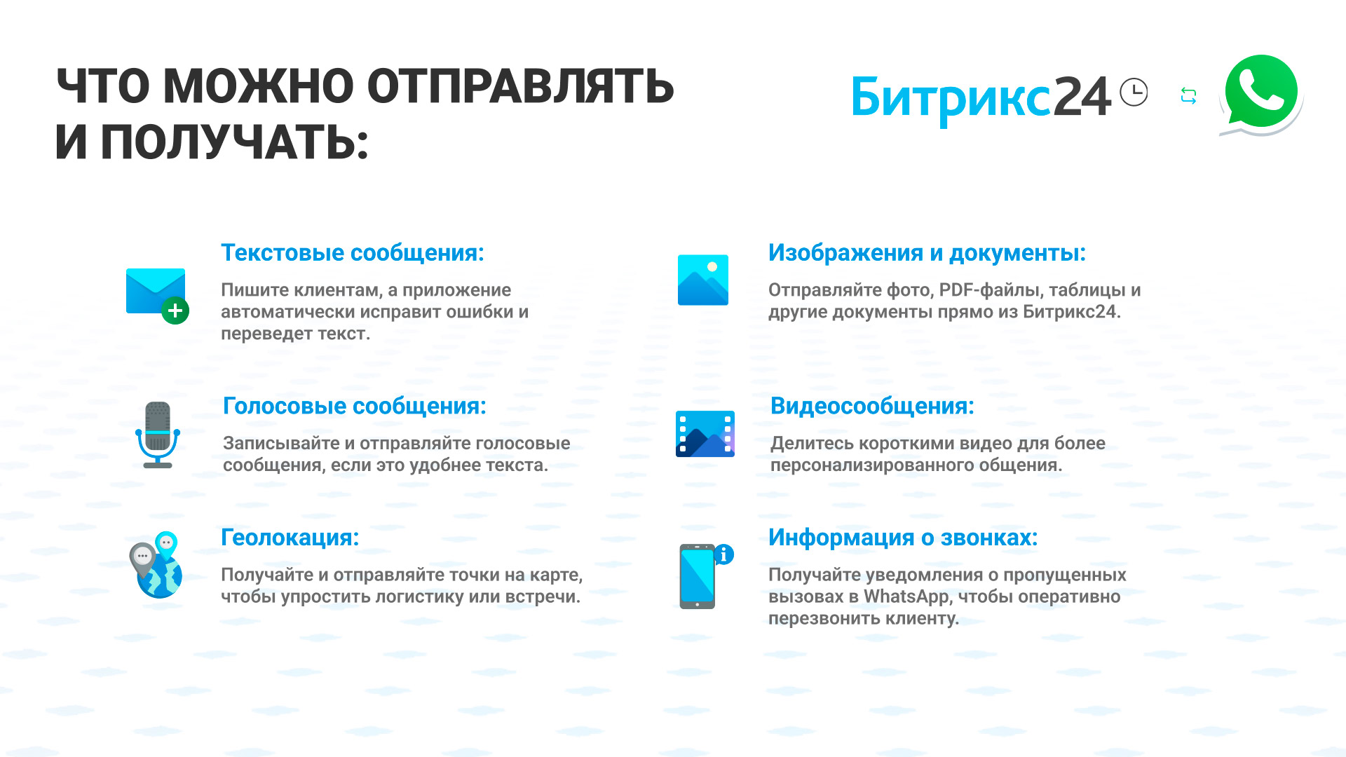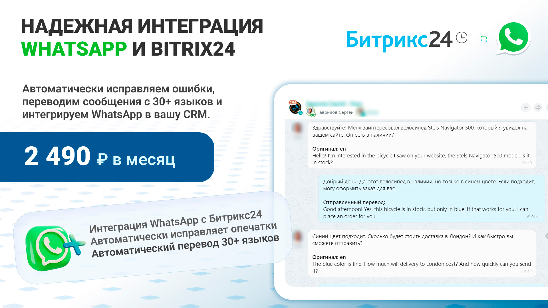 - Полная интеграция с Битрикс24: WhatsApp в сделках, лидах, контактах и компаниях.