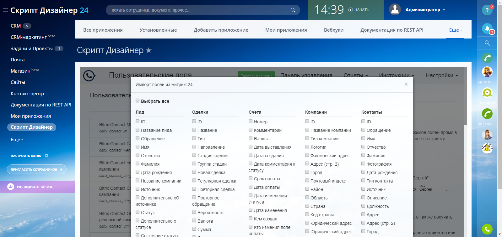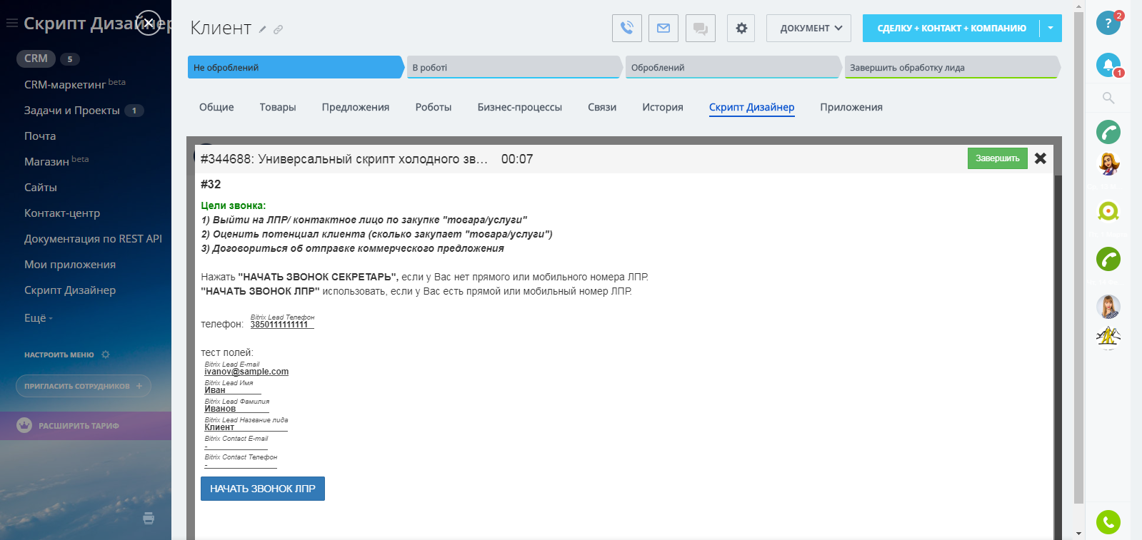 Обменивайтесь данными пользовательских полей между Битрикс24 и Скрипт Дизайнером во время звонка по скрипту (с внесением и редактированием данных в поля и сохранением данных в карточке Битрикс24);
