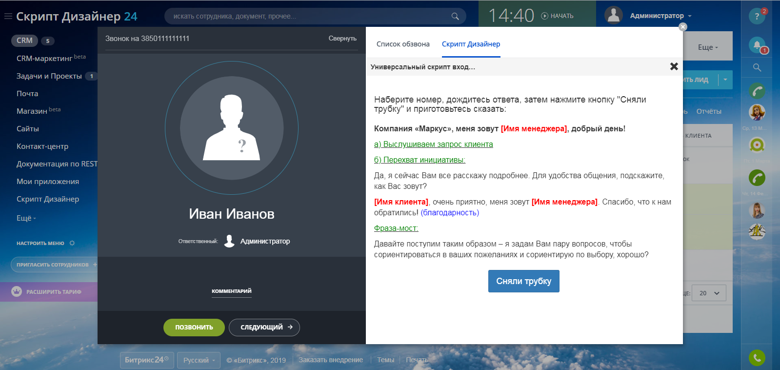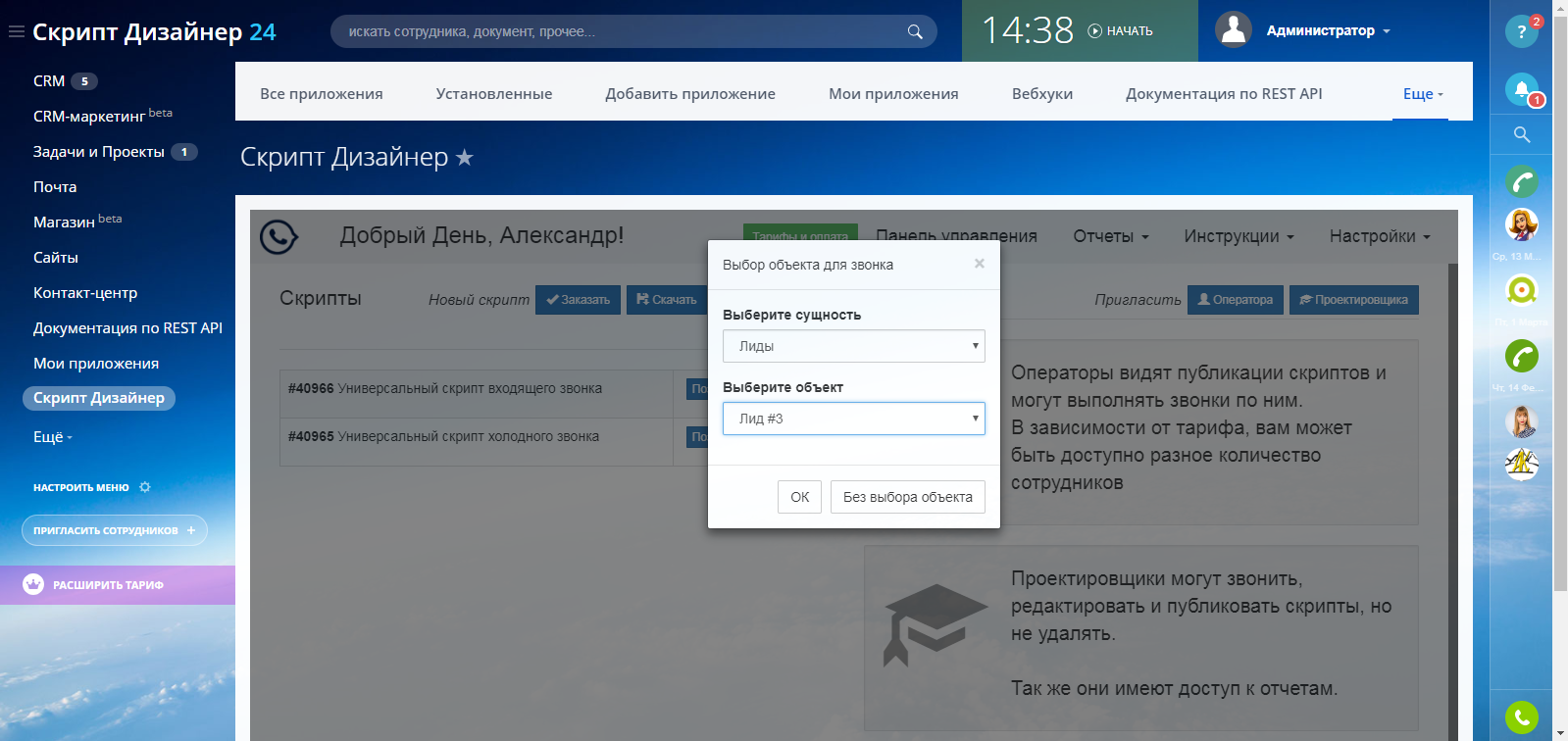 Вносите коррективы в скрипты, просматривайте статистику и совершайте звонки прямо из Битрикс24;