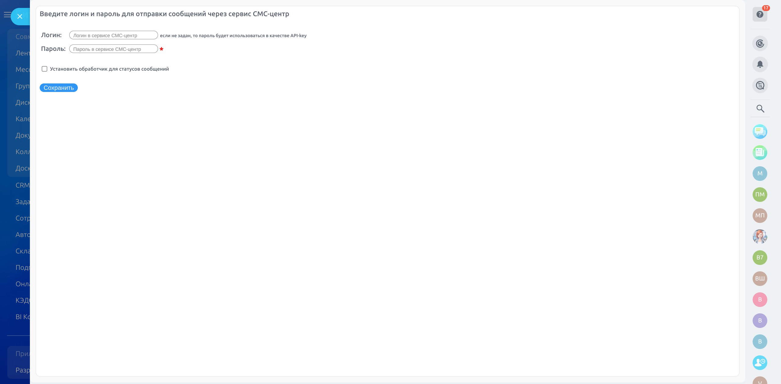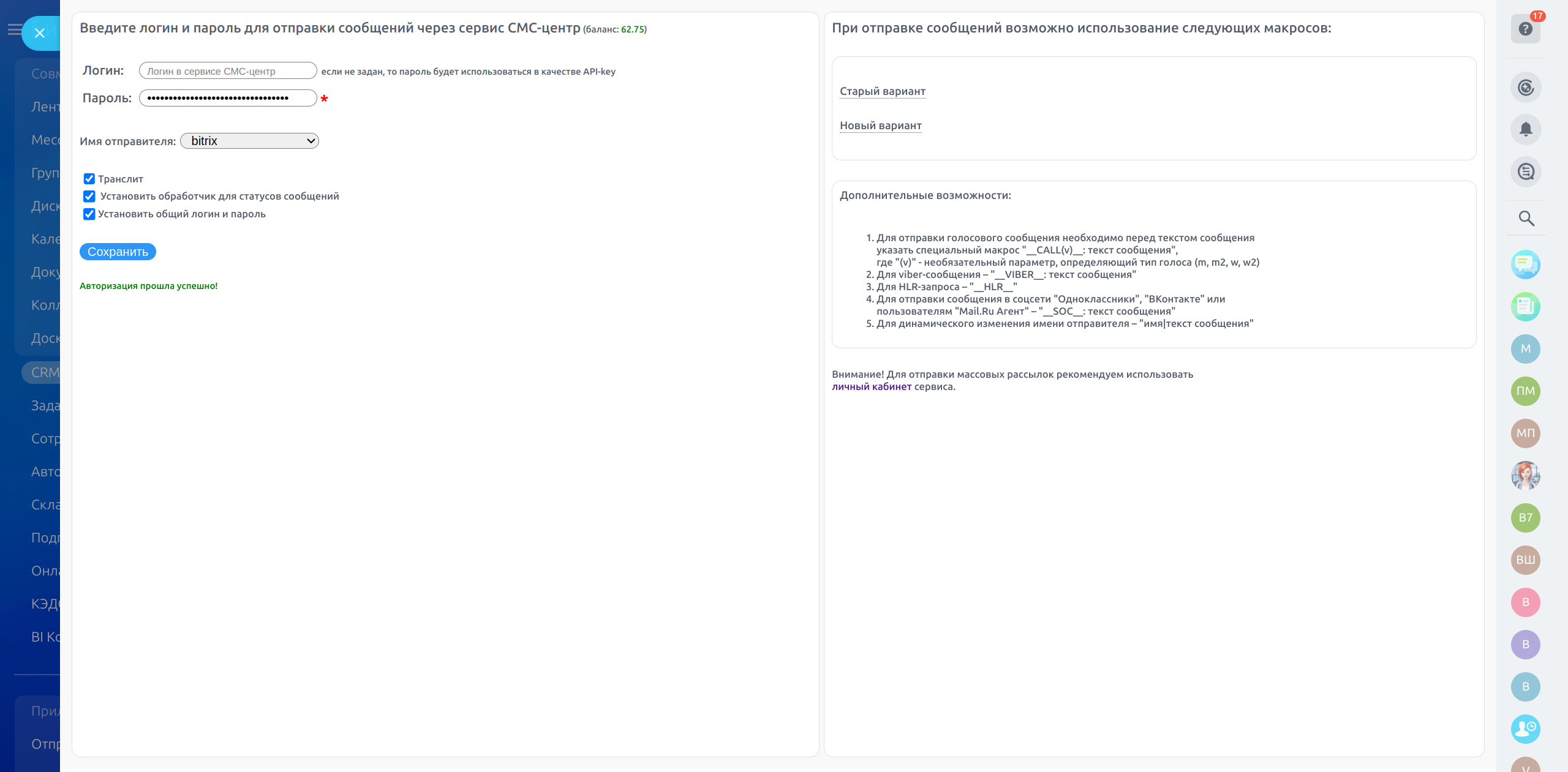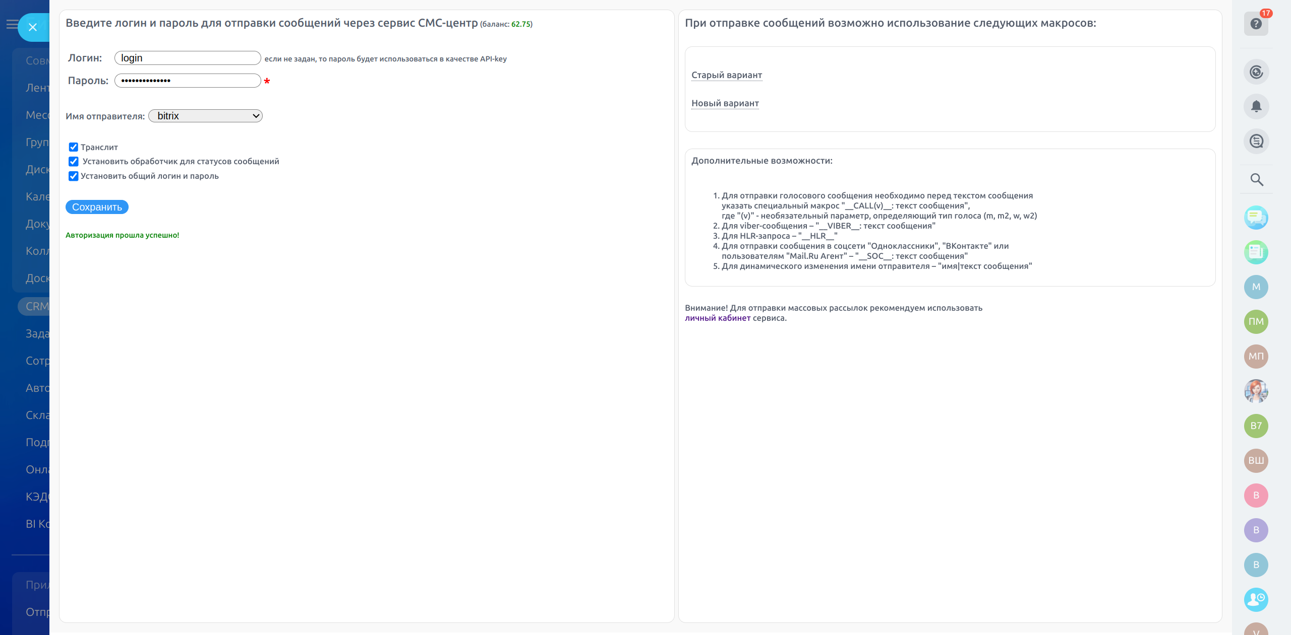 Приложение позволяет отправлять сообщения из бизнес-процессов, роботов и карточек CRM через сервис СМС-центр.