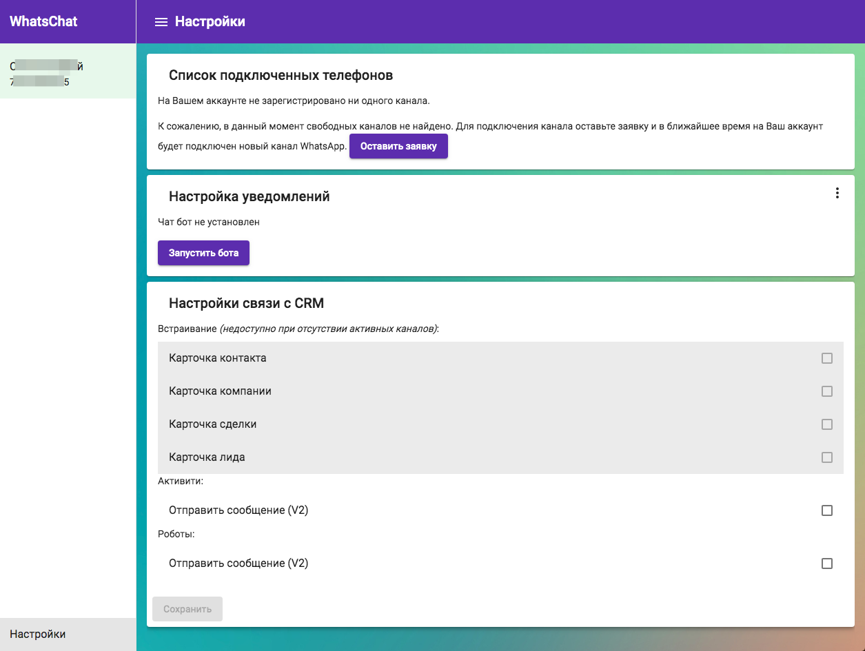 Вы можете подключить в приложение несколько аккаунтов WhatsApp и переписываться с разными клиентами с разных номеров телефона. (На 1 канал может быть подключен только 1 номер телефона)