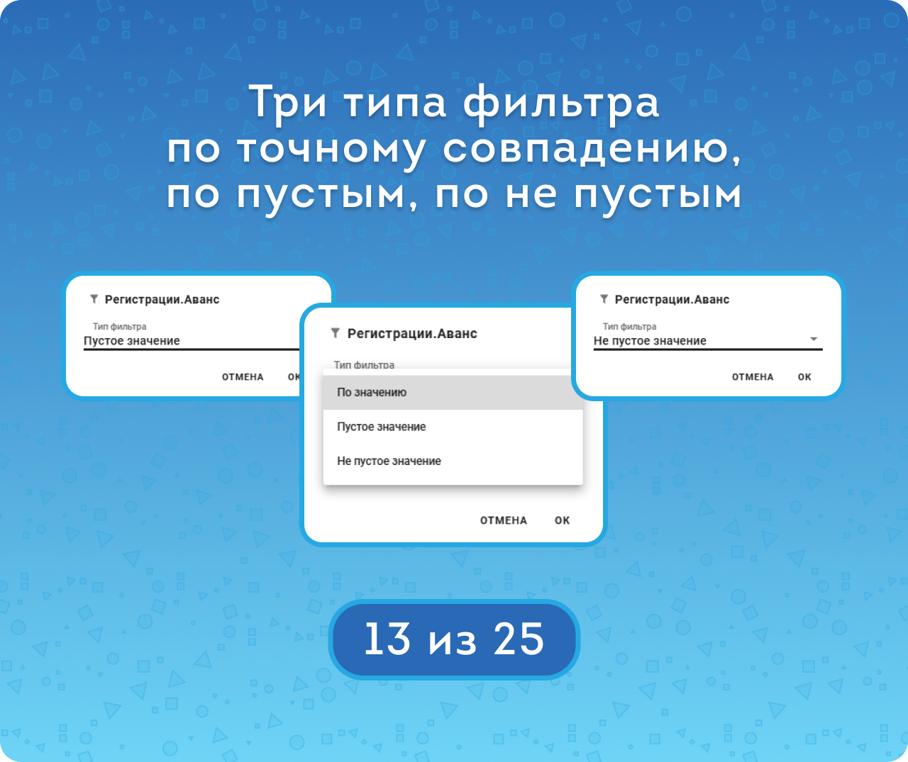 Дополнительная фильтрация (по значению, по пустому и по не пустому значению) поможет точнее настраивать отчёты, исключая лишние данные и фокусируясь только на нужной информации.