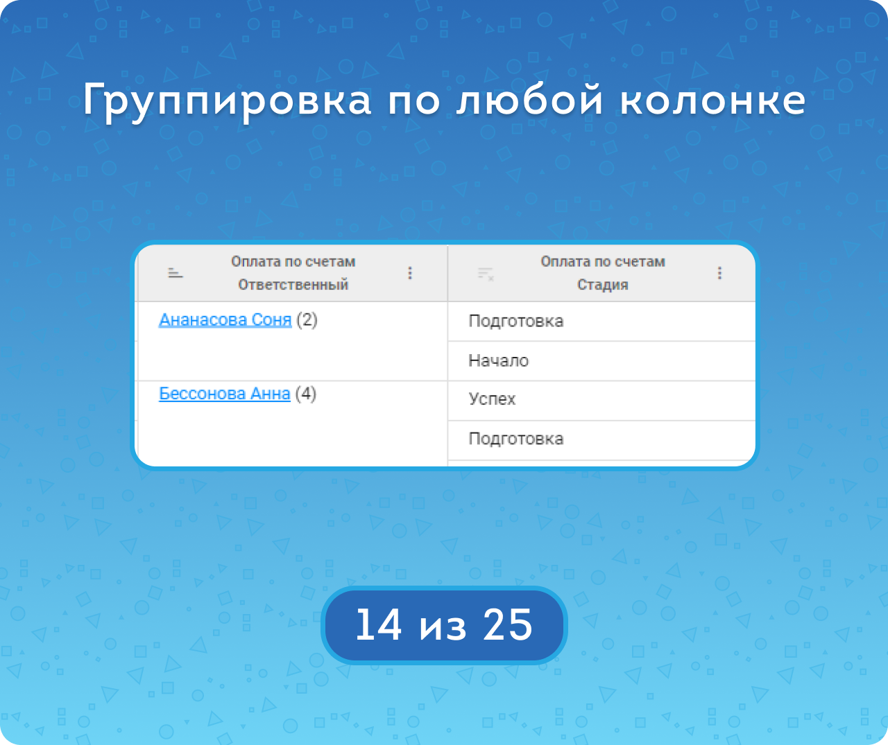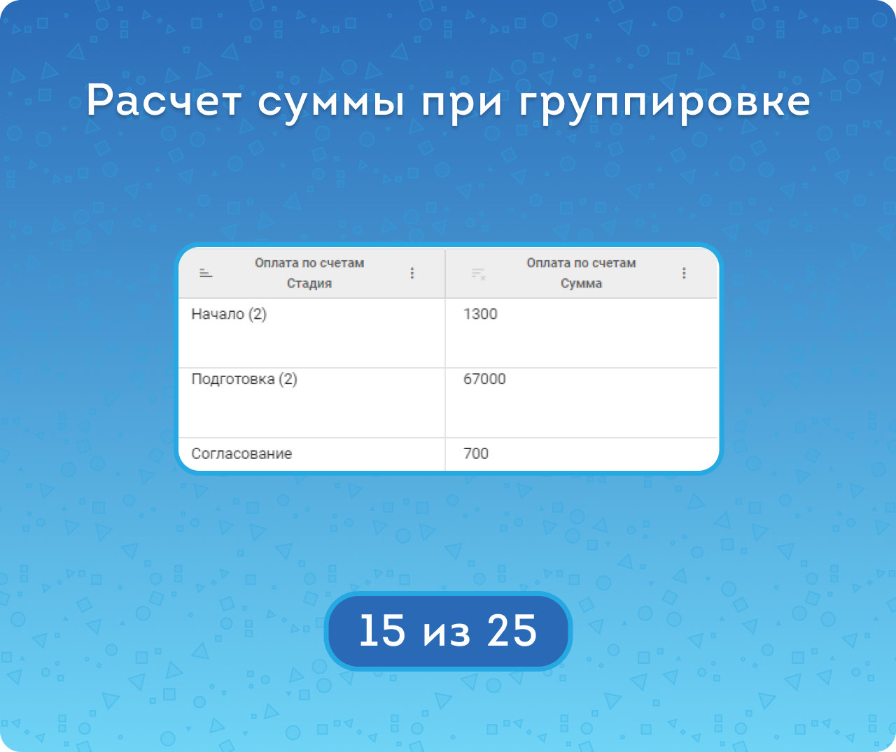 — Используя группировку, видеть промежуточные итоги помимо общих. Например, сколько элементов смарт-процесса в каждой стадии. А также группировать по временным периодам — дням, неделям, месяцам, кварталам или годам.