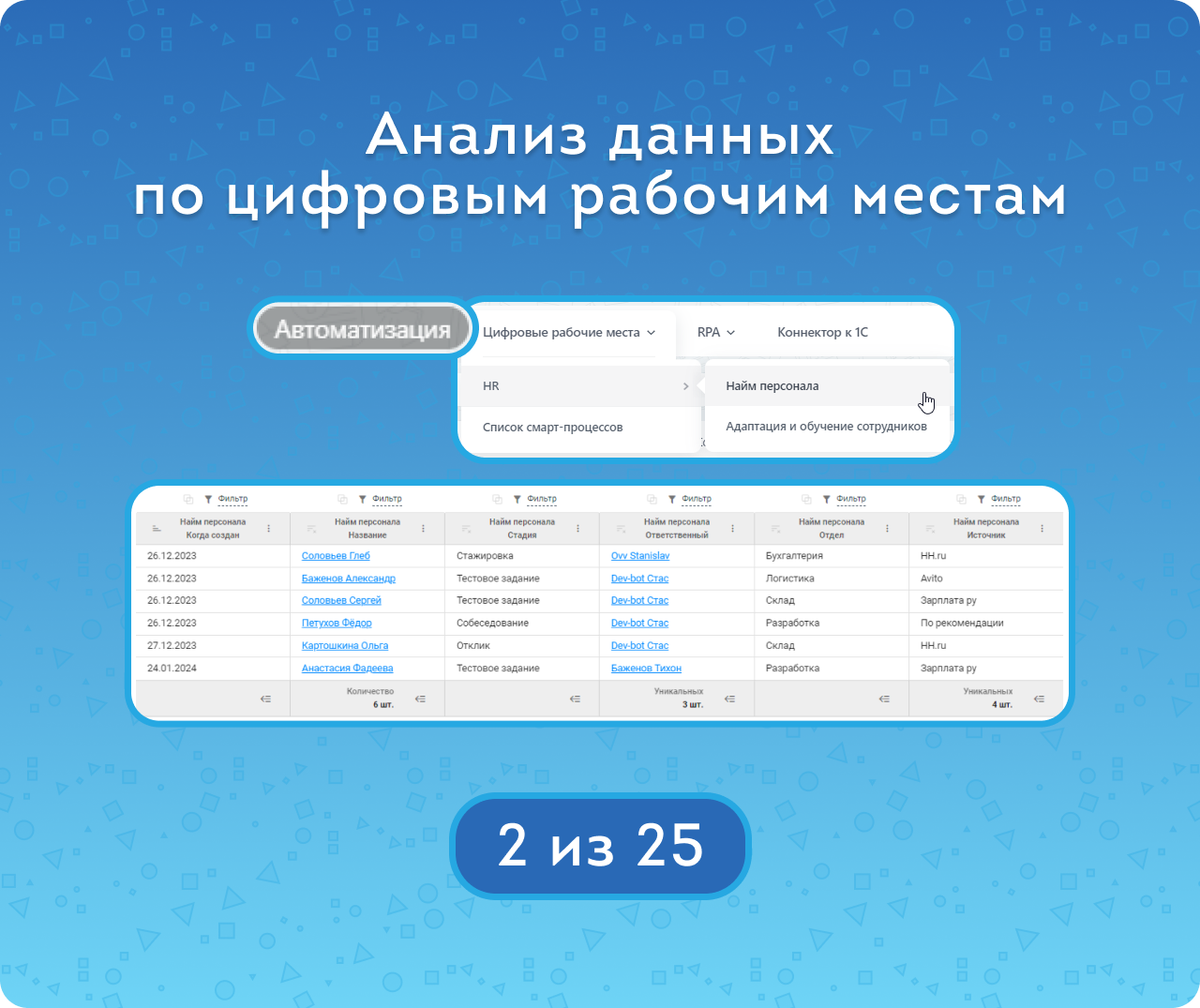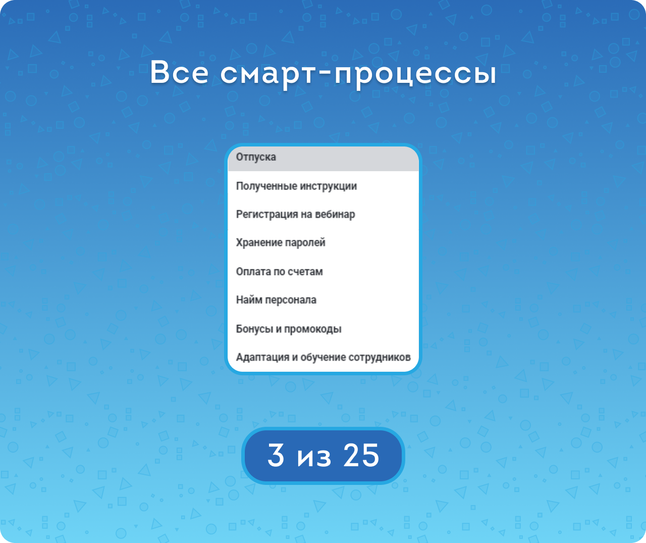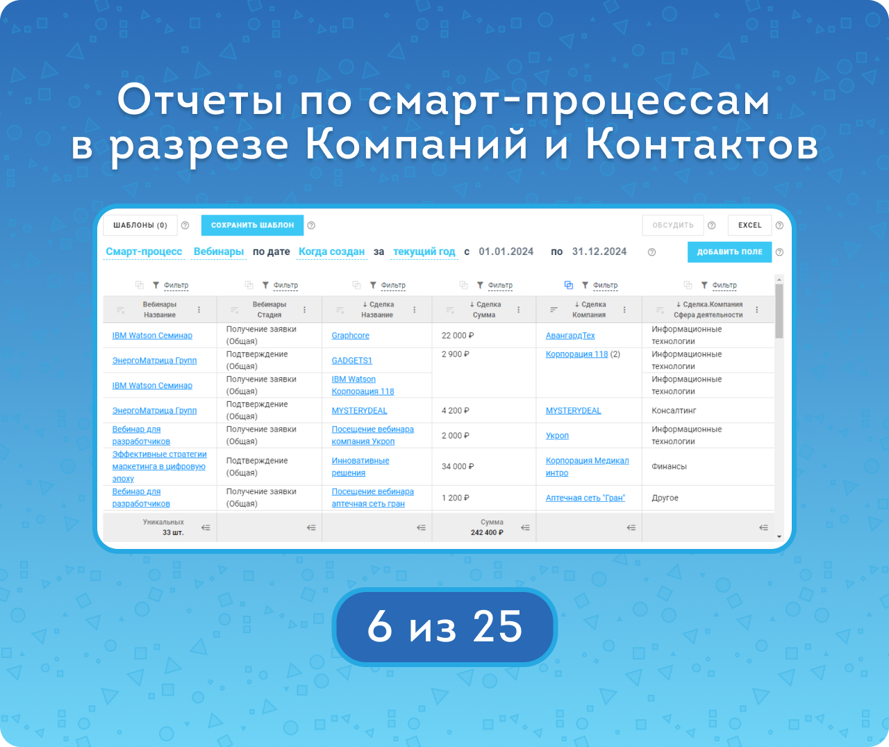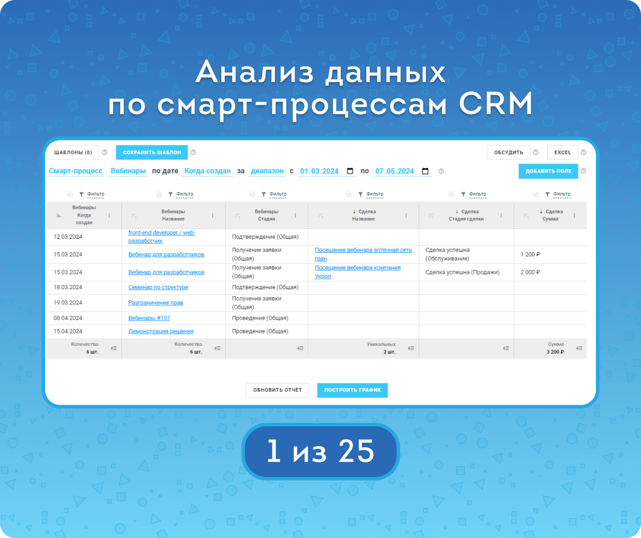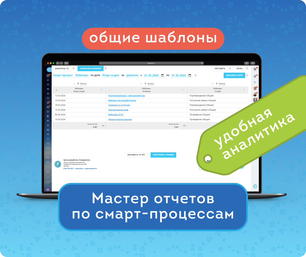 — Строить отчёты по всем смарт-процессам вашей компании, в том числе, по тем, которые не связаны с CRM (Цифровые рабочие места).