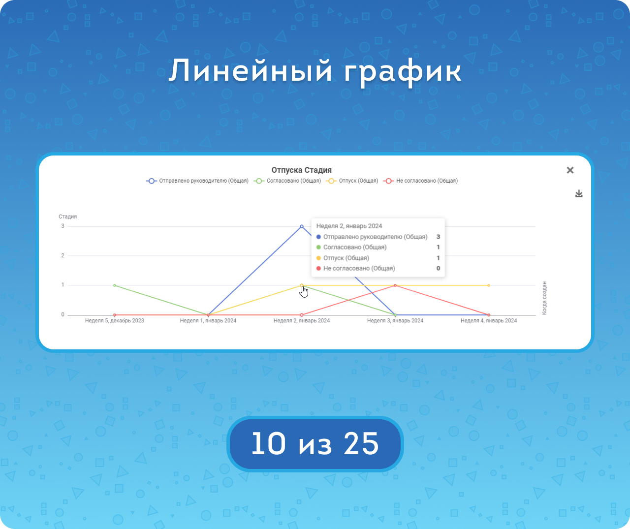 Вы можете построить отчет по смарт-процессу, не связанному с CRM. Он может как быть частью Цифрового рабочего места, так и являться чем-то совершенно отдельным. Например, если вы ведете учёт отпусков в рамках смарт-процессов, то вам будет полезен отчет, сколько заявлений на отпуск уже было согласовано в этом месяце.