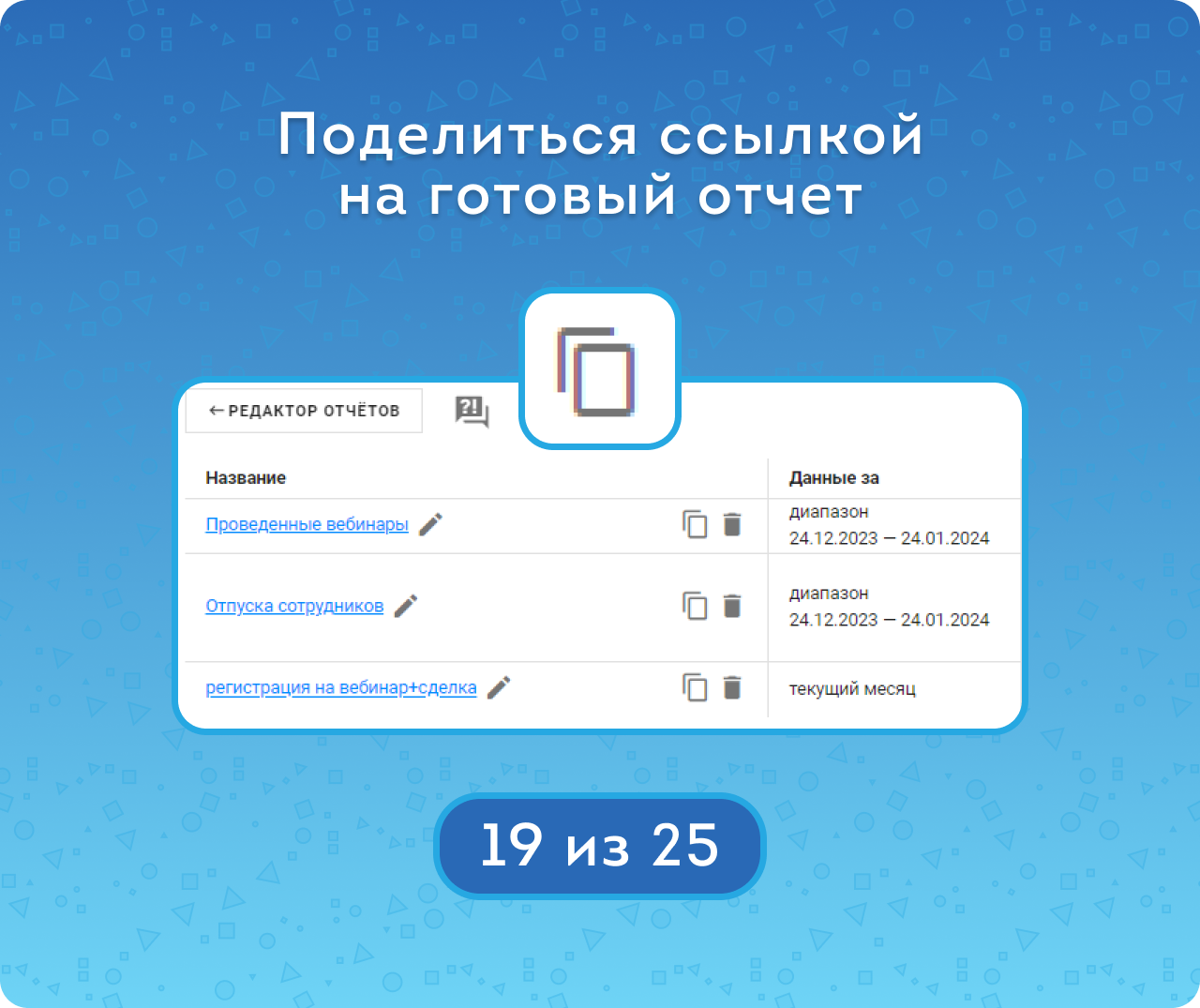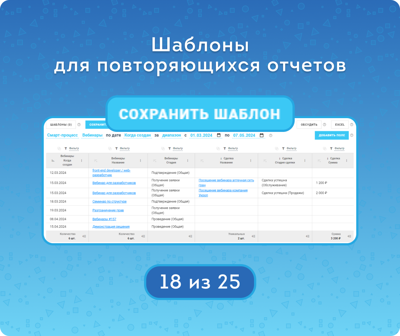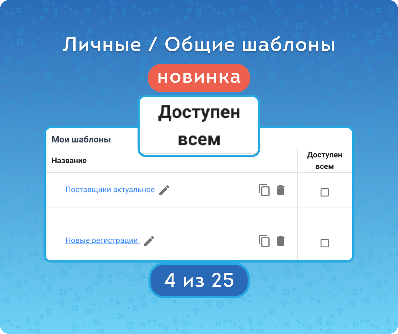 Любой отчет можно сохранить как шаблон с заданными полями, сортировкой и фильтрами. Шаблон можно сделать публичным — тогда он будет доступен всем сотрудникам портала. При необходимости им легко поделиться по ссылке.
