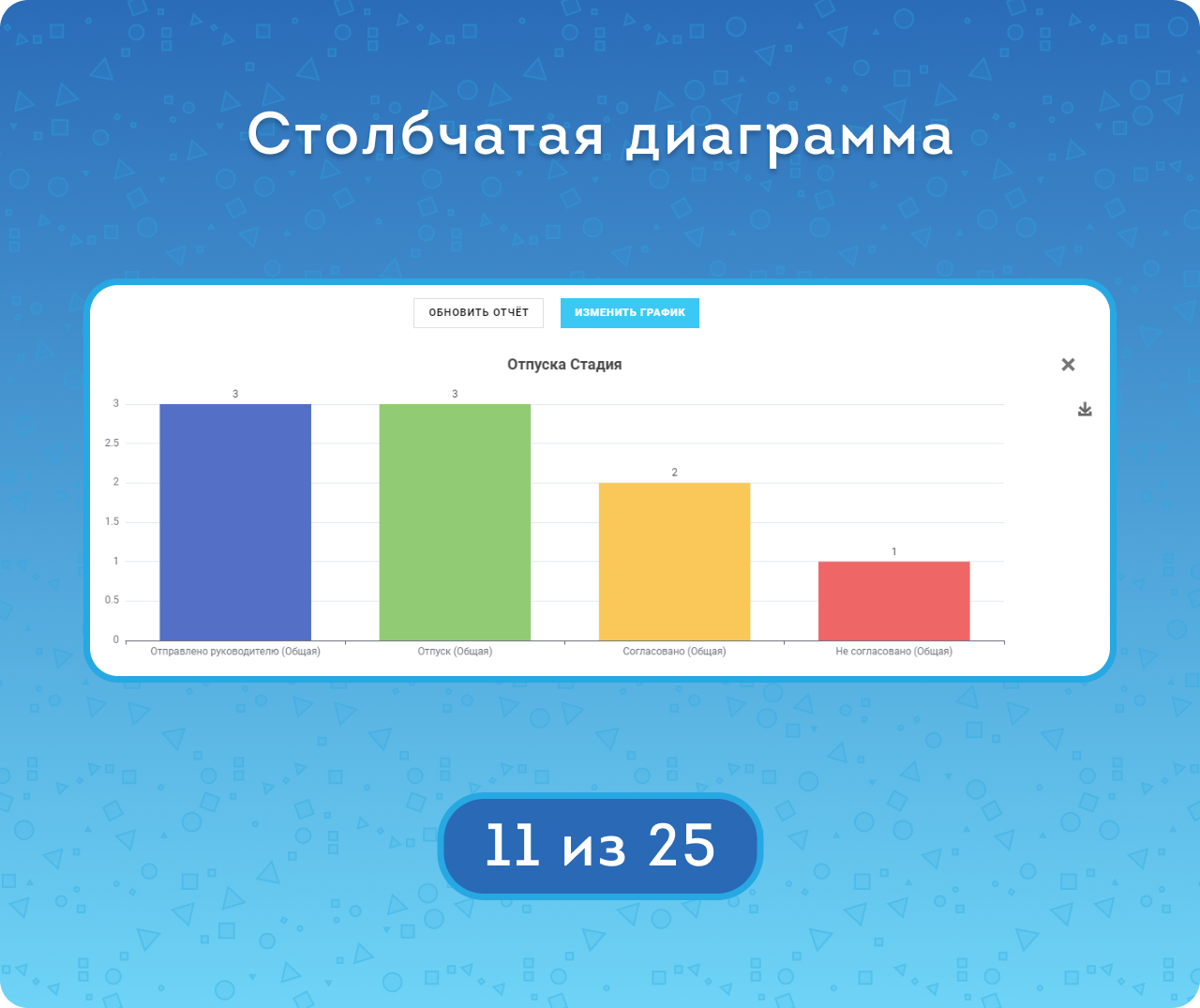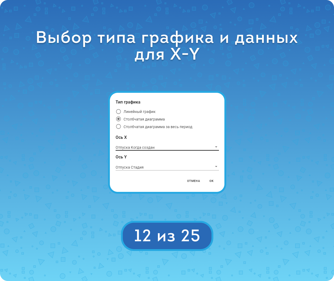 Для того, чтобы выделить в вашем отчете самое важное — используйте графики. Так воспринимать информацию станет проще. Кнопка «Построить график» находится под таблицей, можно выбрать тип графика и подходящие поля для осей Икс (любая дата) и Игрек (числовые и списочные поля).