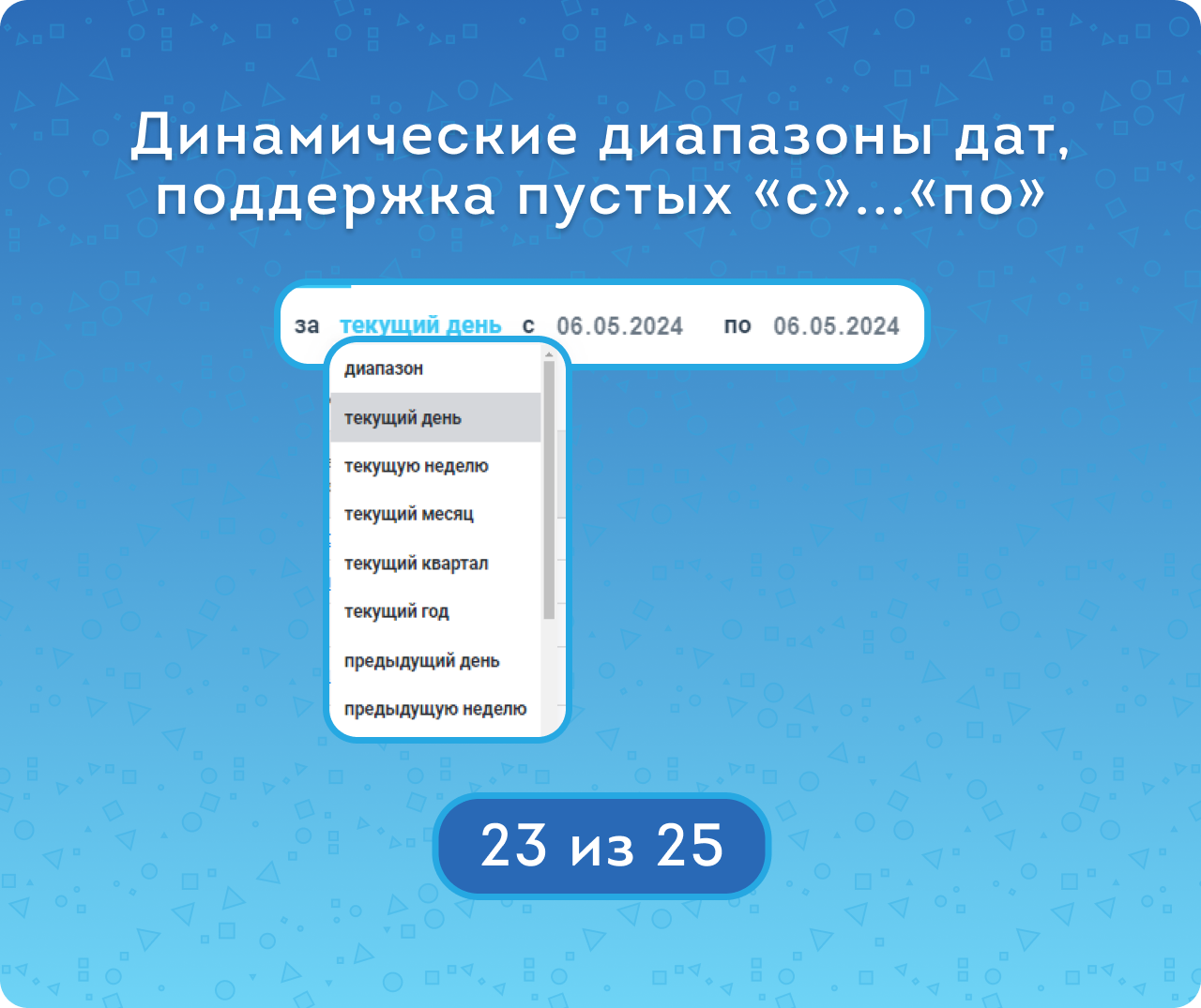 — Удобно выбирать данные за диапазон, текущий и предыдущий день/неделю/месяц/квартал/год, а также за последние N дней. А если в диапазоне убрать даты “С” и “По” — можно вывести данные за весь период.