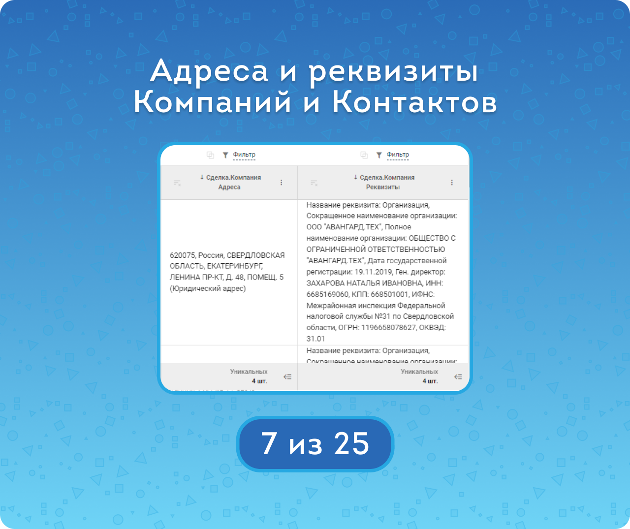 Обратите внимание: все адреса выводятся в одной строке. Аналогично с реквизитами. Кроме того на текущий момент выводится только один привязанный к Сделке (Лиду или Счету) Контакт. Привязанные напрямую к Смарт-процессу Компании или Контакты не отображаются.