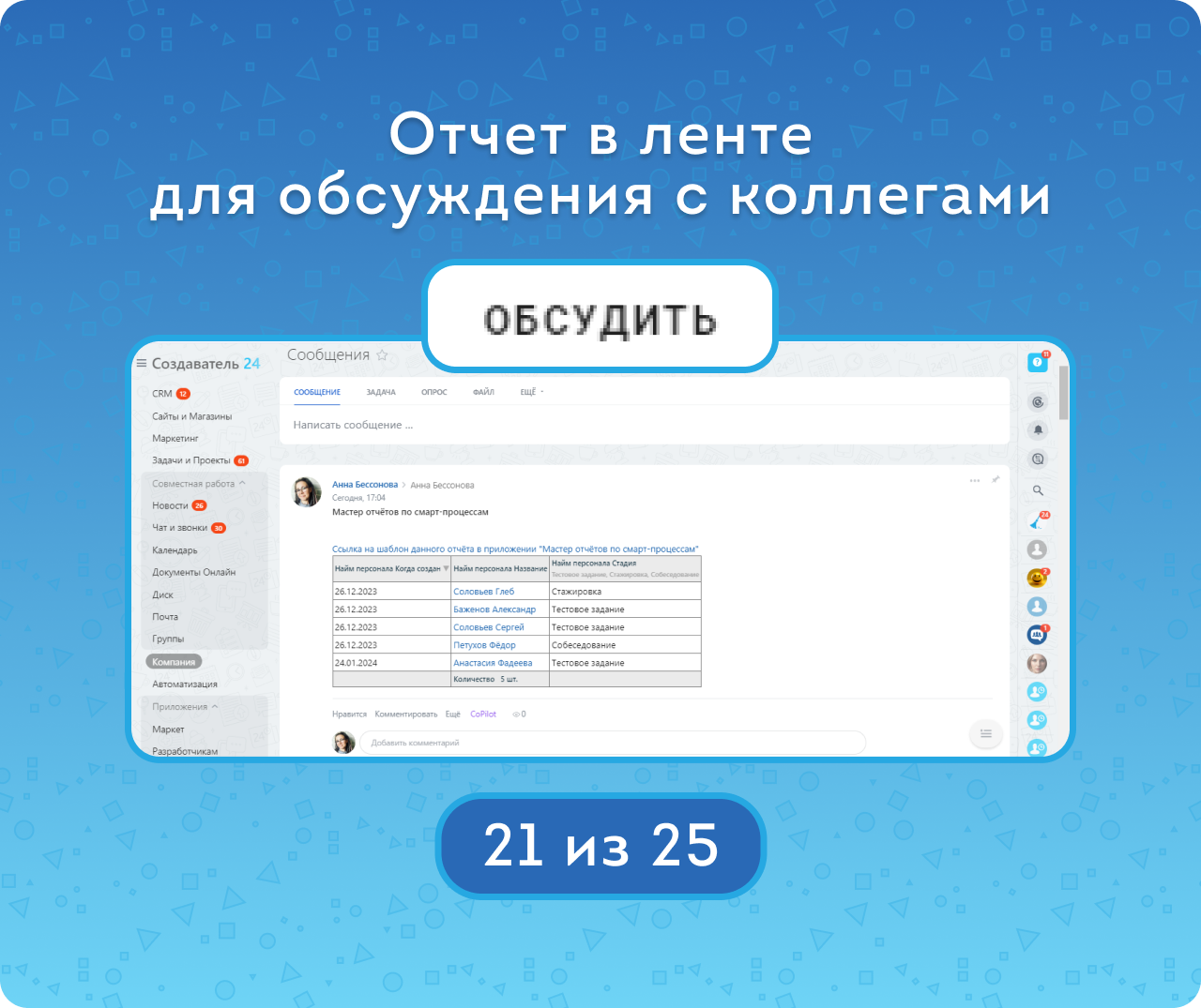 — Опубликовать отчёт в Ленте новостей для обсуждения с коллегами.