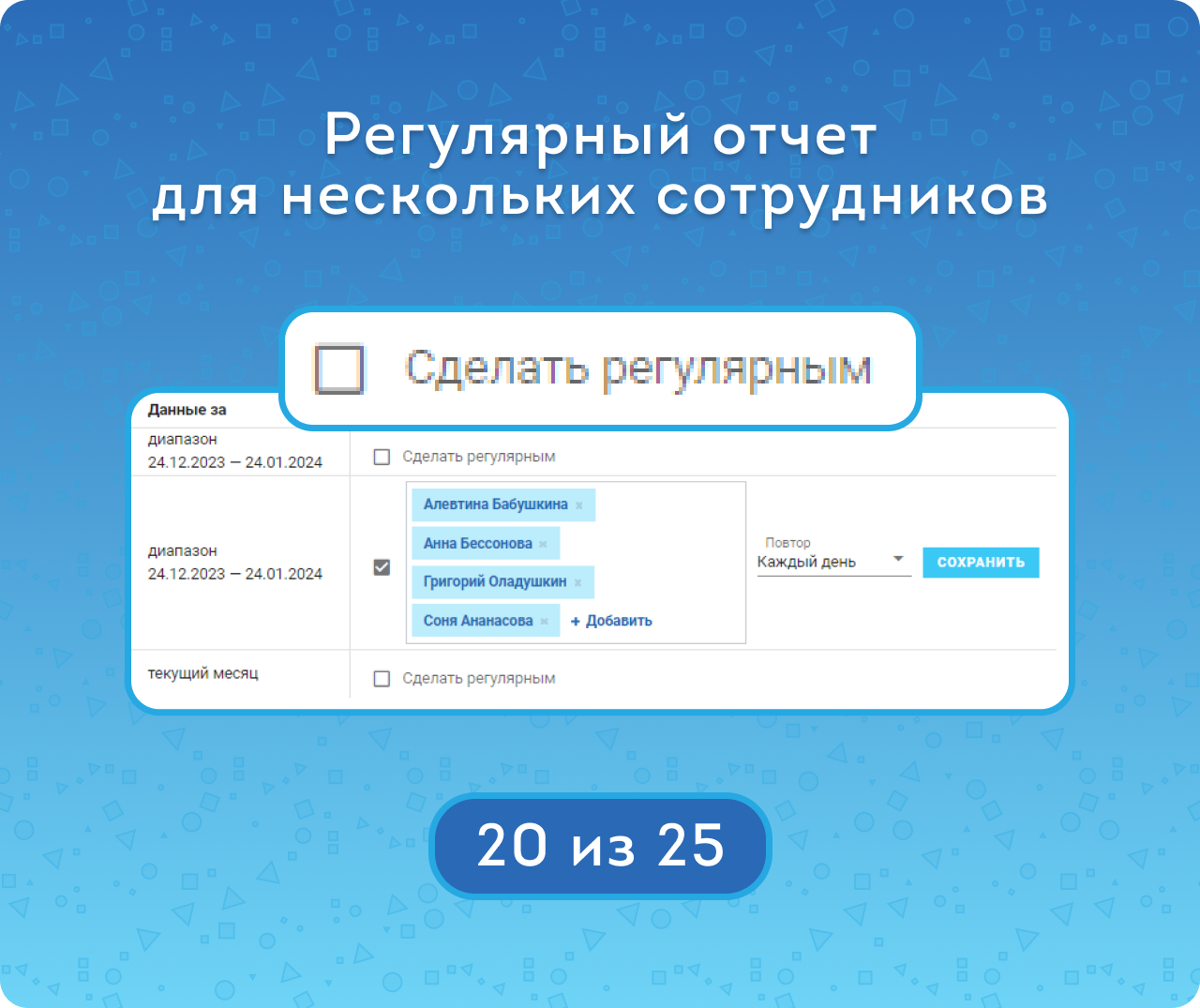 — Настраивать отчеты для регулярной публикации в Ленту Новостей.