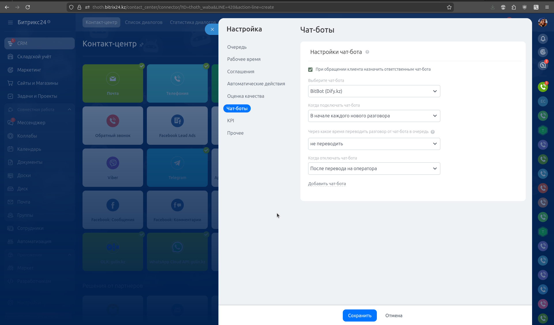 Бот, собранный в Dify.ai, будет отвечать клиентам напрямую из каналов Битрикс24, а все коммуникации сохраняются в CRM‑карточках лида/контакта.