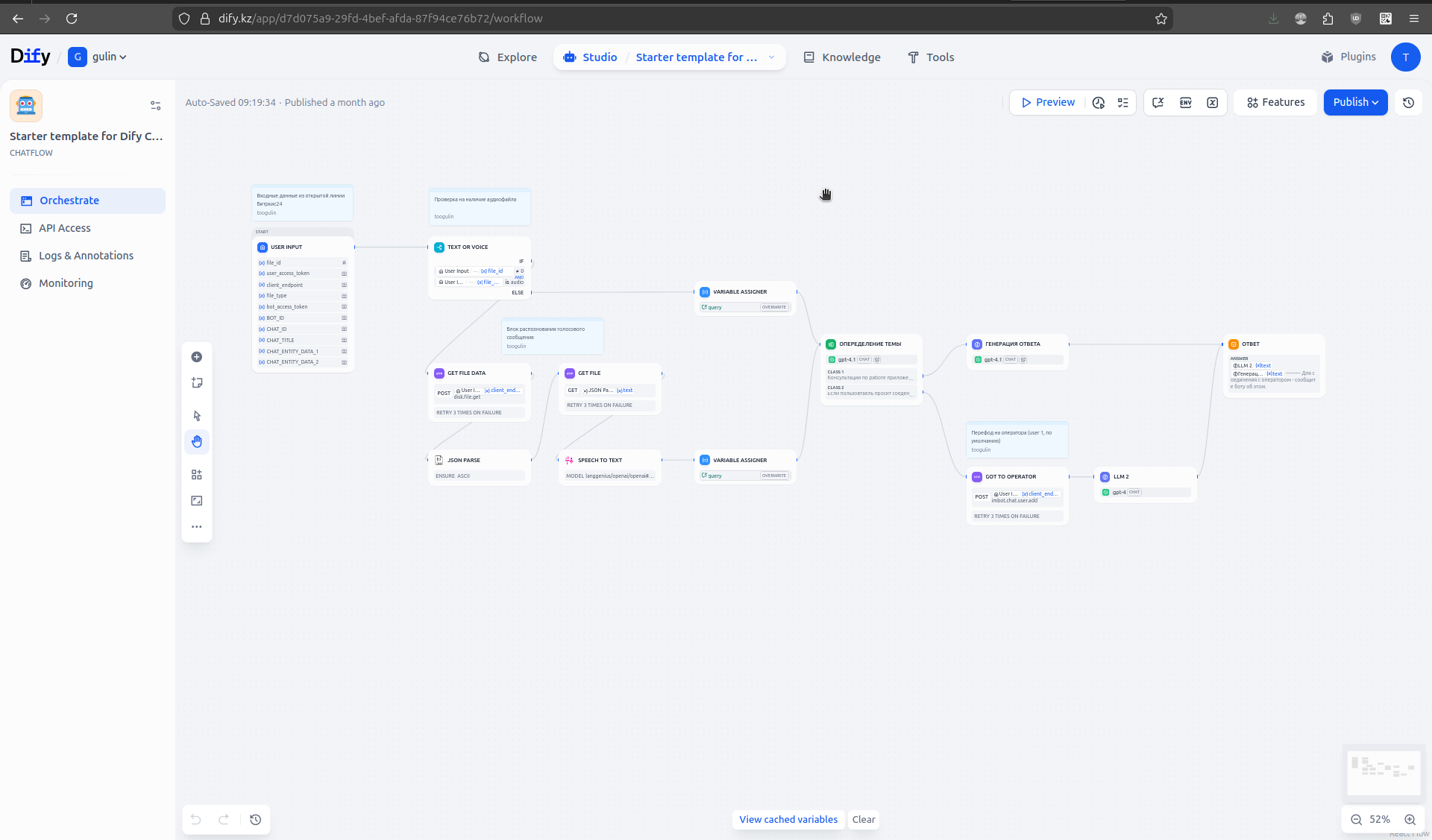 Dify.ai позволяет создавать сложные workflows — цепочки из нескольких шагов обработки информации. С помощью BitBot эти цепочки можно использовать для: