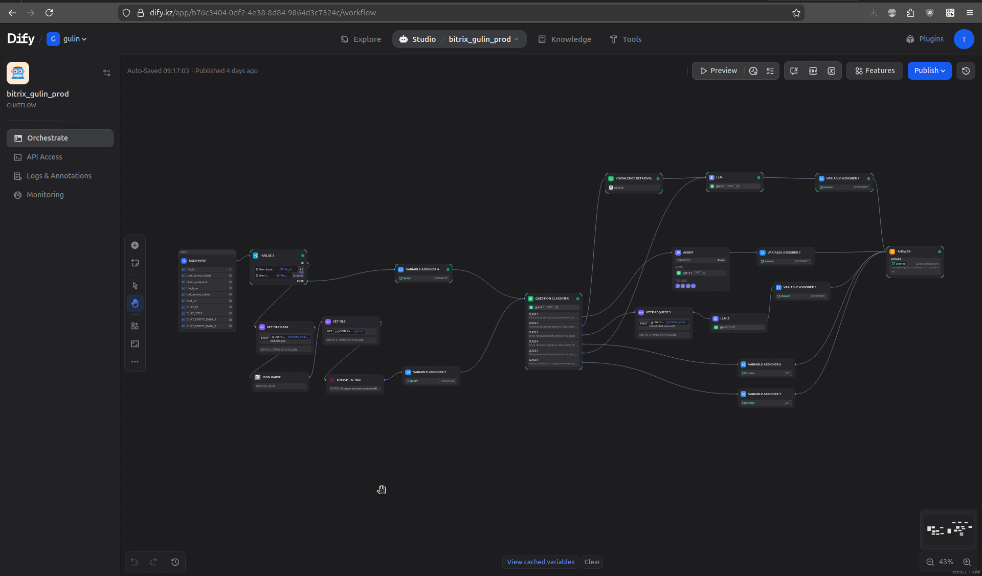 Что такое Dify.ai и зачем он нужен в Битрикс24Dify.ai — это конструктор AI‑приложений и чат‑ботов, в котором можно визуально собирать цепочки обработки запросов: от анализа входящих сообщений до генерации ответов, работы с документами и интеграции с внешними системами Documentation Index Fetch.txt.