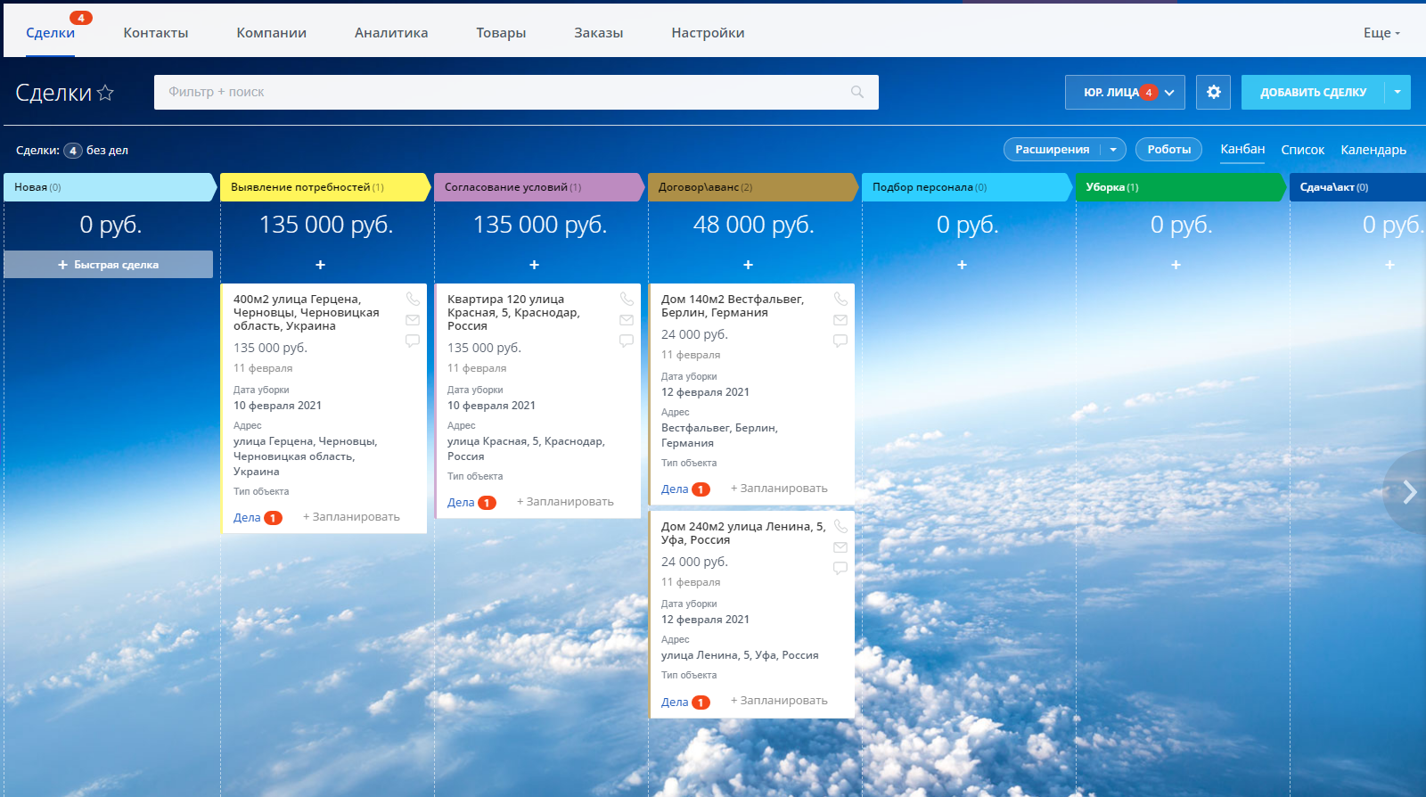 Мы предлагаем использовать режим работы со сделками, поэтому основная воронка состоит из статусов (Новая, Выявление потребностей, Согласование, Подбор персонала, Уборка, Сдача работы/Получение отзывов).